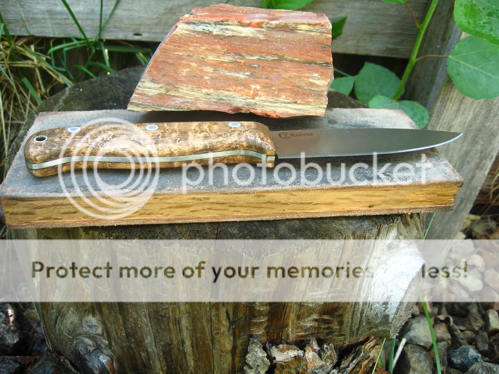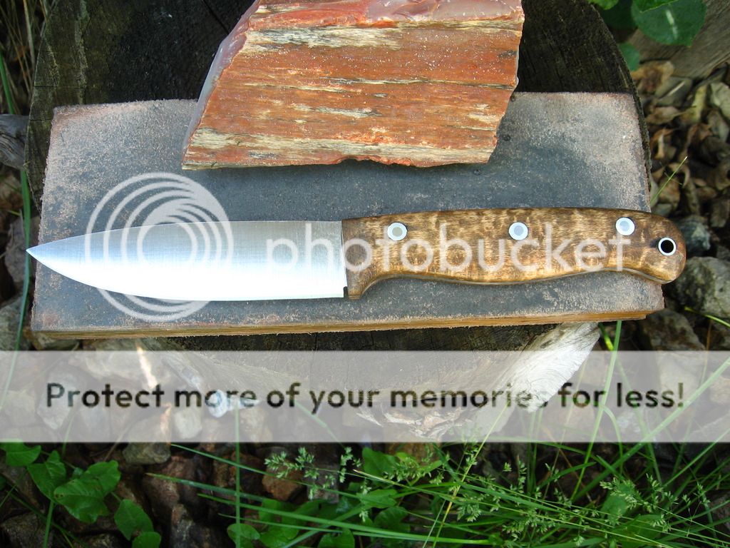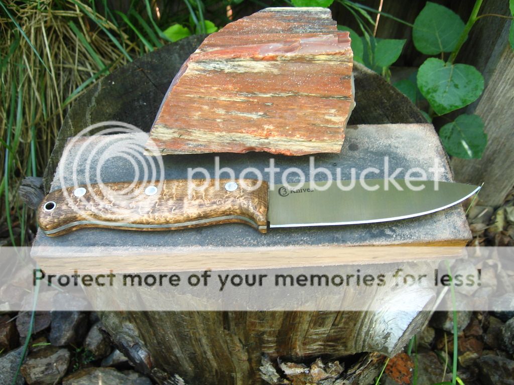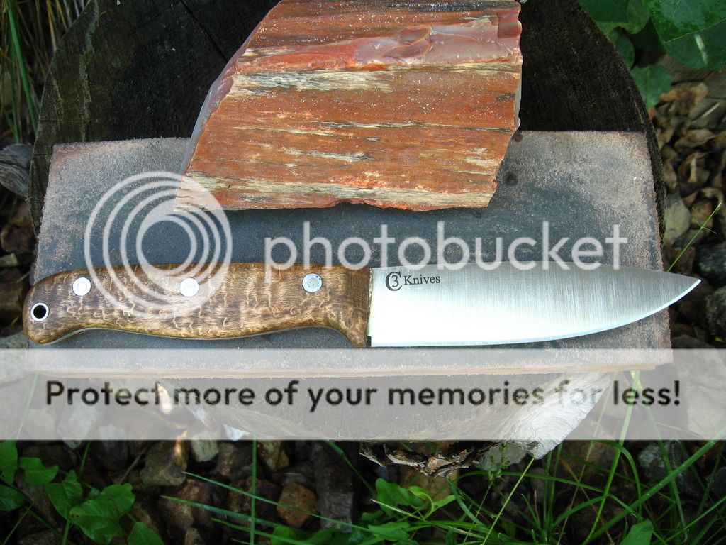 3/32" CPM 3V, maple handle, Heat treat and RC checked at 58 from Peter's, 4.7" blade. No sheath $110 delivered lower 48. email if interested or paypal is cecody@msn.com