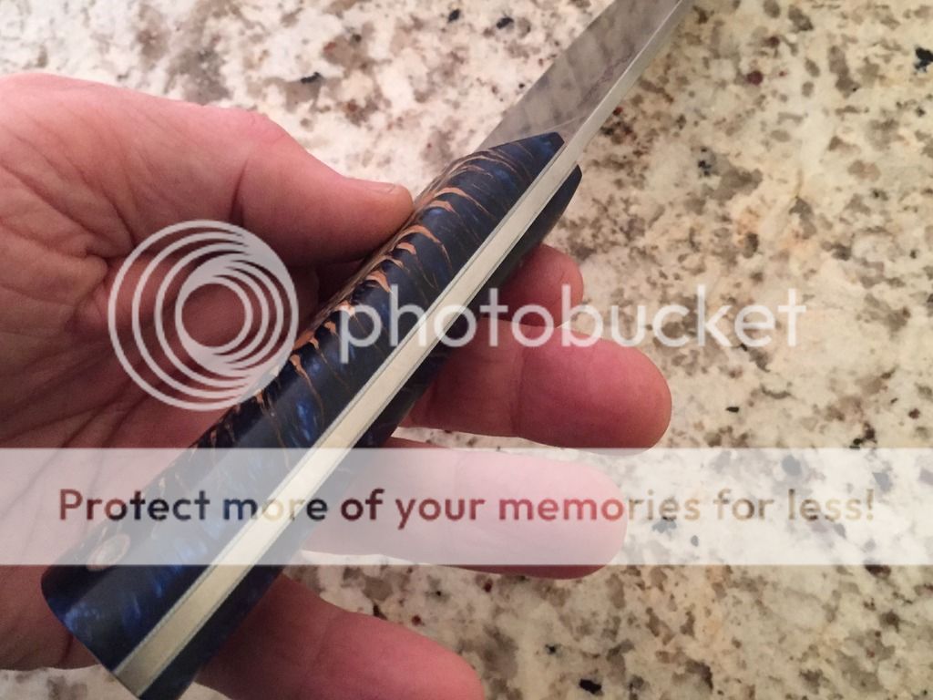 Blade: 4.5" full flat grind, 1 1/2" wide, 0.01" thick before sharpening, satin finish with 600 grit cork belt