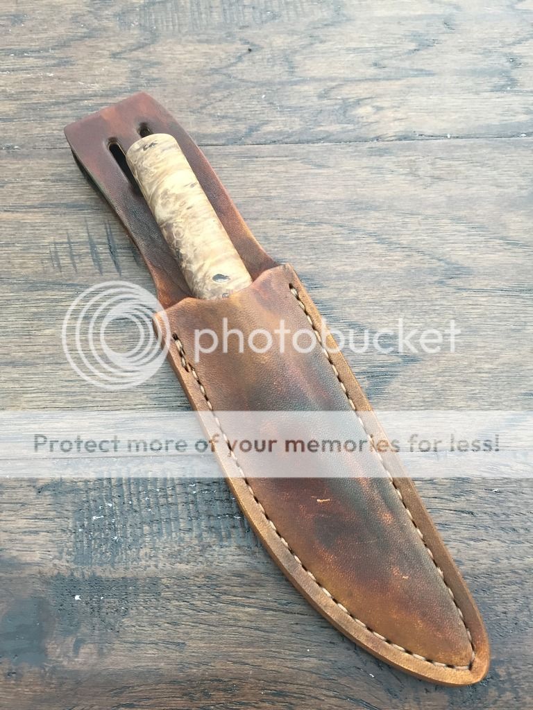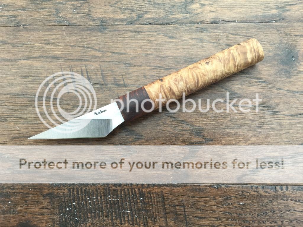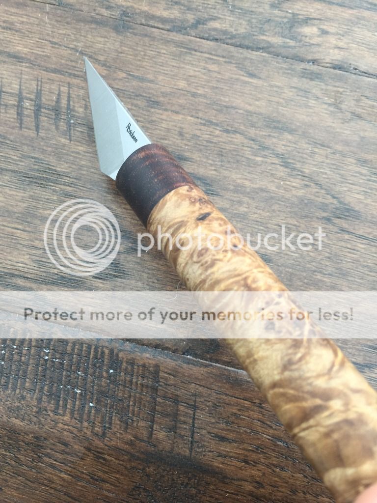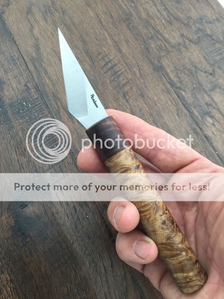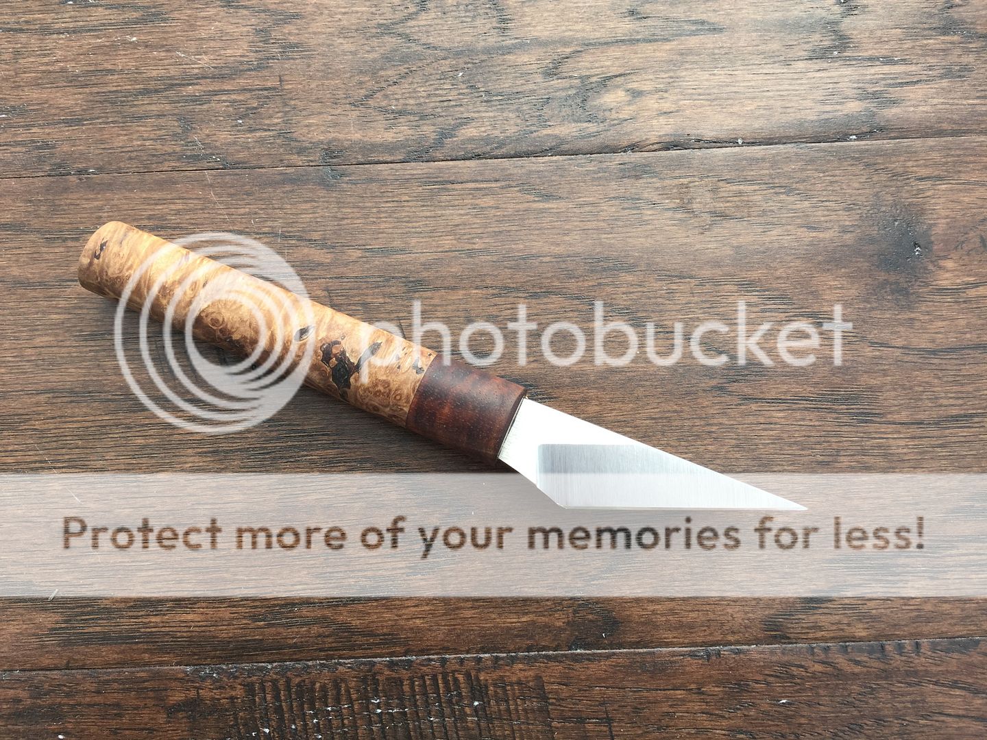 I'm offering this Kiridashi up for sale today. It's 3V steel heat treated by Peter's to RC60. The handle is stabilized Spalted Maple Burl and stabilized Koa. It comes with a leather sheath. Both the flats and bevels are satin finished with "gator" belts and I took the edge down to 0.005" before sharpening. Should make a great little utility knife.