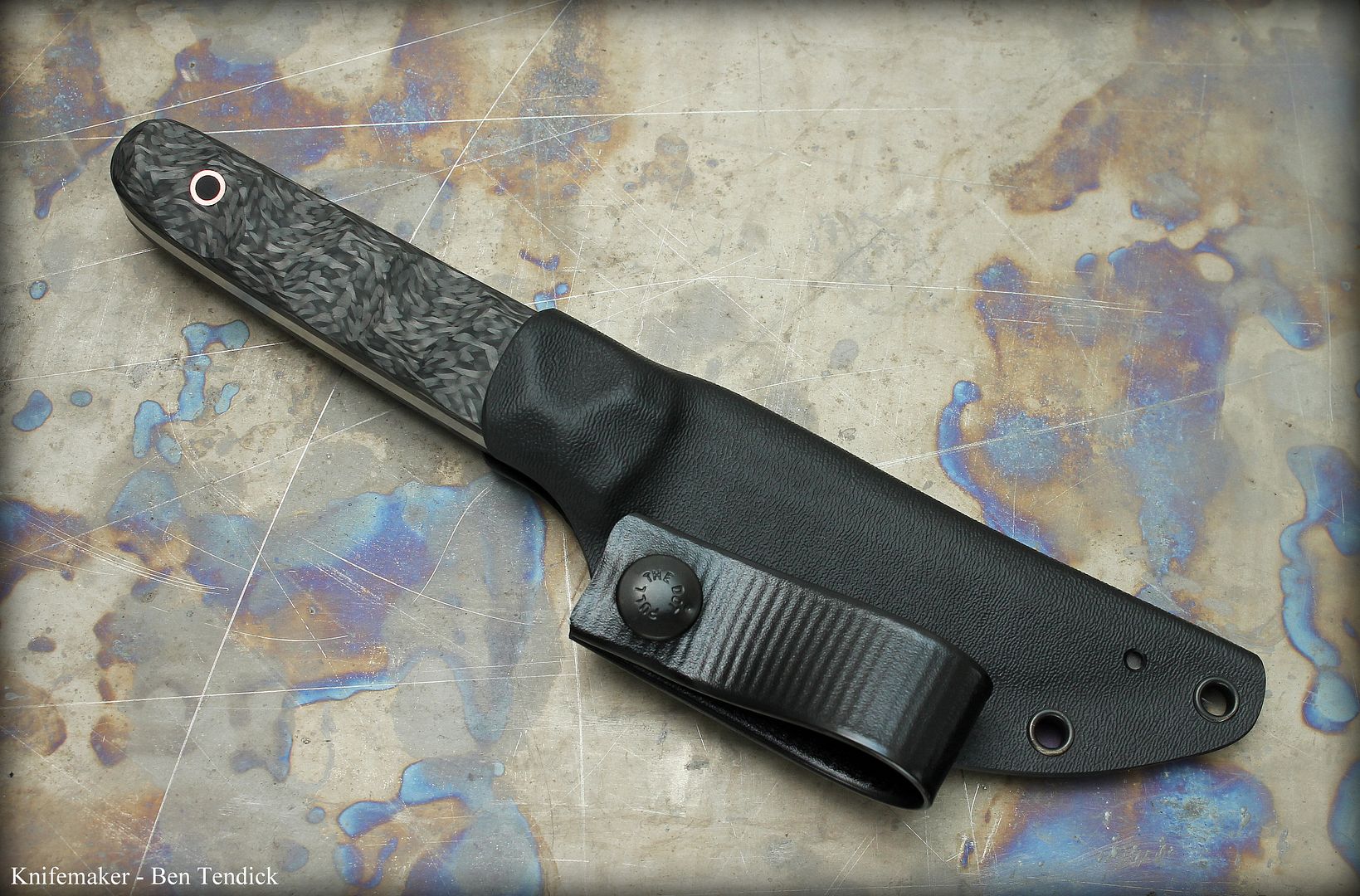It has scalloped carbon fiber scales and my signature tapered fuller on the spine.