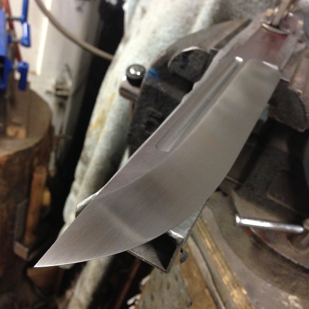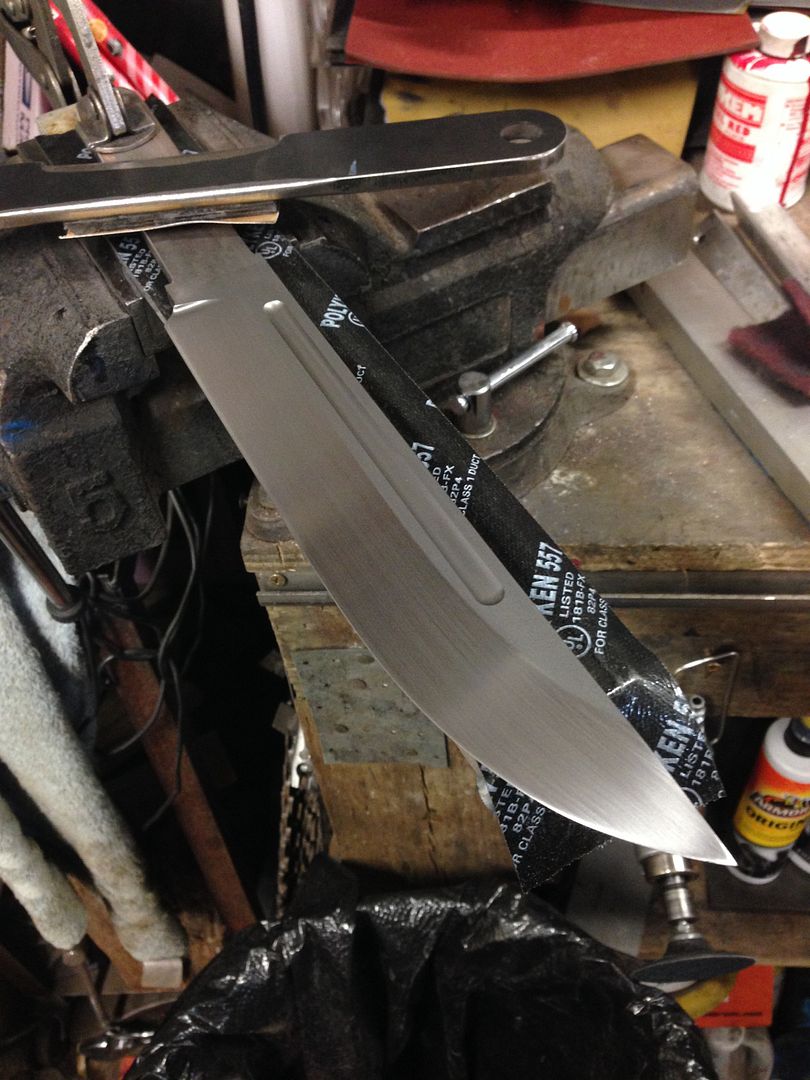 Skip ahead.....I ground it up to 400 grit and then hand sanded the bevels. It is much easier to get any grind lines out before HT. It gets hardened in a SS foil pouch, so It can be very close to finished before HT.