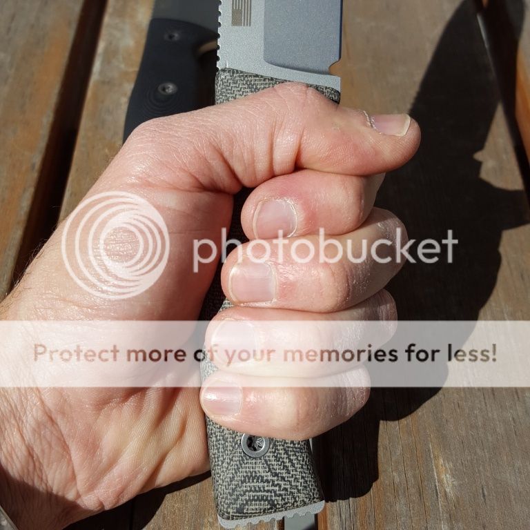 This knife is just slightly smaller than the new 4.7. At first it doesn't really seem visually smaller, but in hand you get an "oh... this is different." It is somehow an immediate difference to your muscle memory - I don't know how to describe it. The blade profile is the same, just shorter and not as tall from edge to spine. The stock material is also thinner (0.160" vs 0.175"). The handle, while it has the same new-spec GSO contours, is not quite as down-swept from the middle fastener to the back end. It has maybe 1/8" less down sweep. The belly of the knife is nearly as deep from top to bottom, but the handle is just a little smaller 'circumference'. More on the handle later.