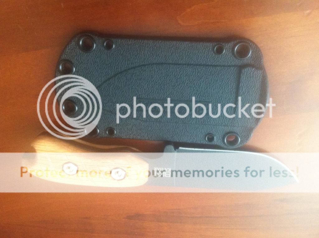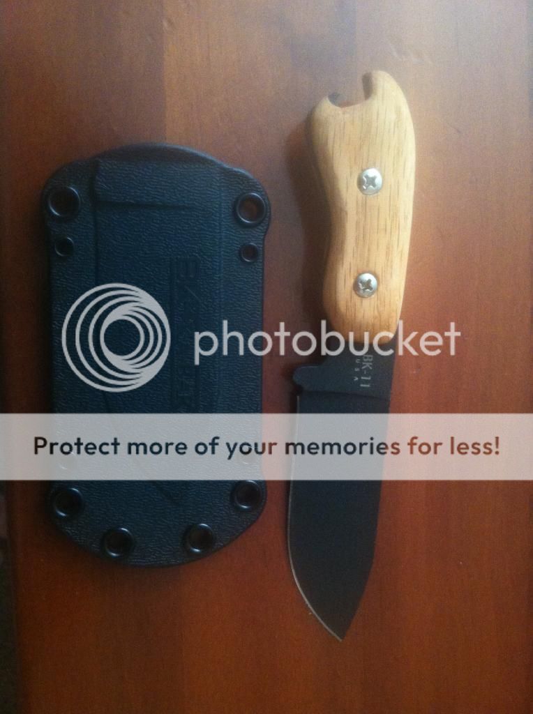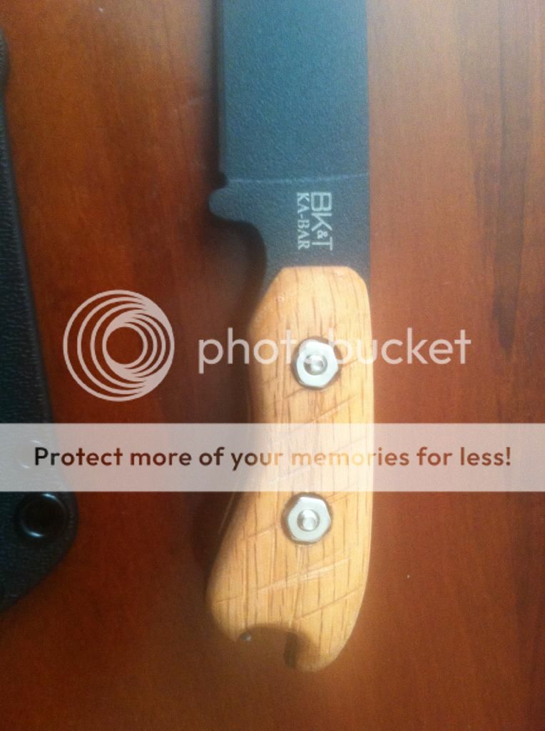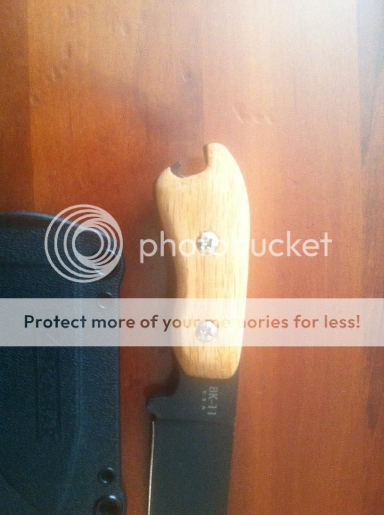 Necker 1: Brand new, never used for cutting nor carried. Has some glue stuck to the paint underneath the wooden scales from where I was gluing the kydex liners to the scales. The scales are red oak with three coats of Danish Oil. The scales have some lines filed into one side where I was going to try checkering them but I stopped. They're attached with stainless screws. I will add pictures of the glue on the knife, won't be able to see it unless you carry the knife bare. The scales or paracord hide it. Will come with a stock sheath. Knife is like new except the glue stains on the tang. SOLD.