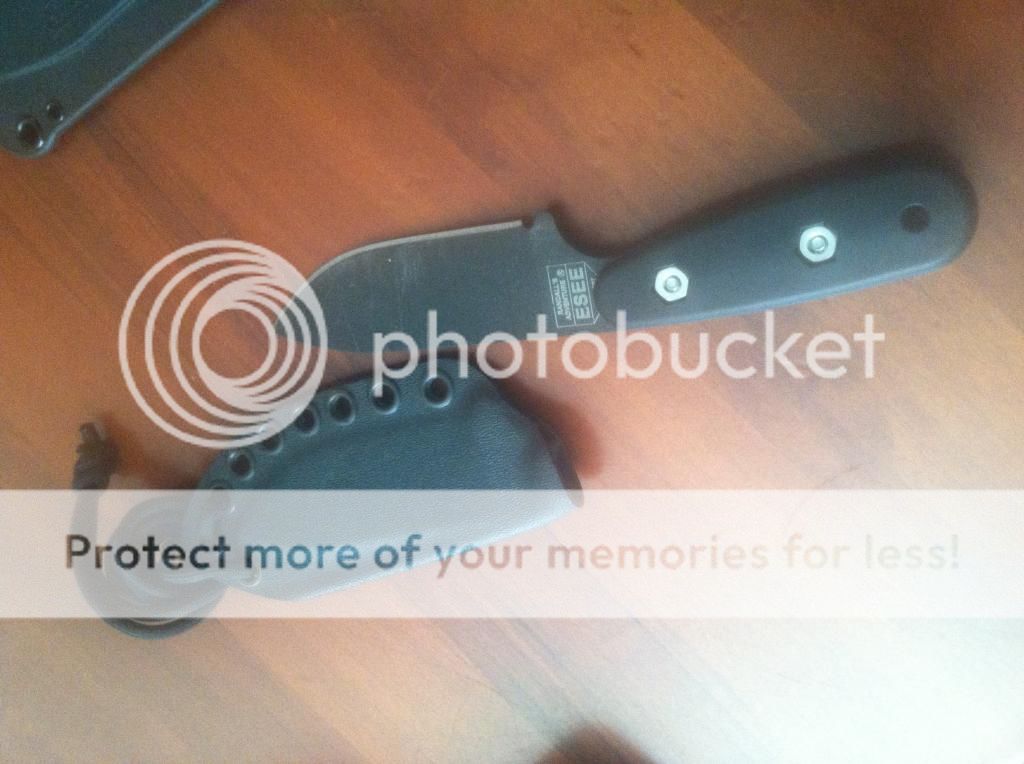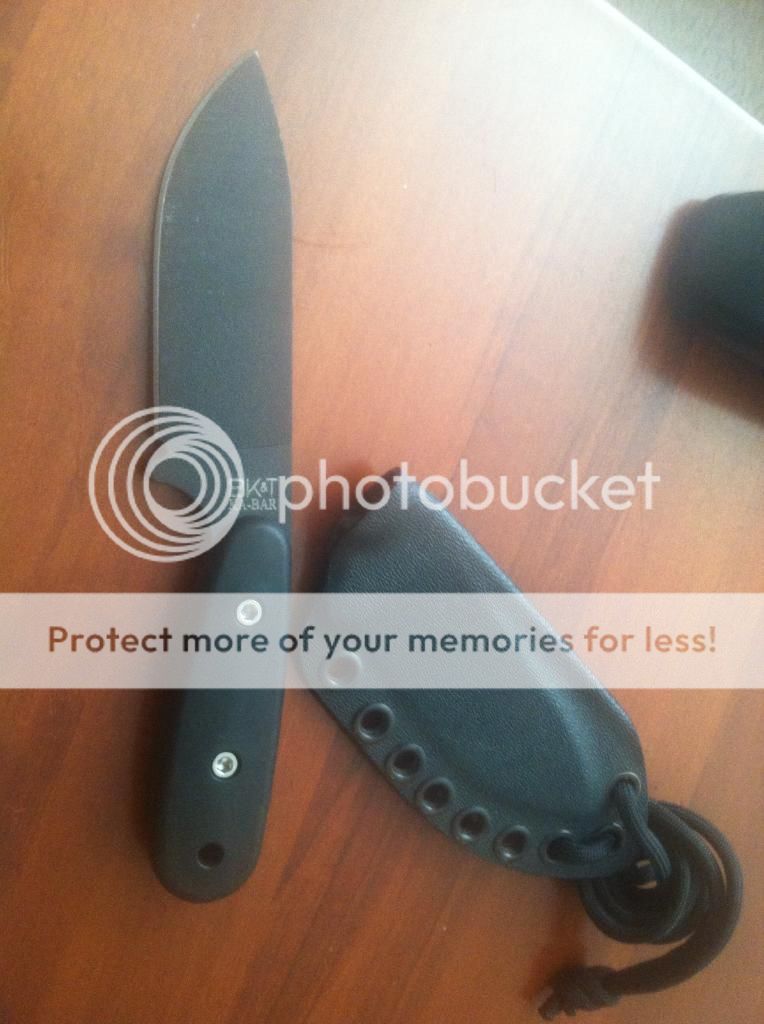 Last but certainly not least is a Becker/ESEE BK14, the Eskabar. The Necker/Izula collaboration between Becker/Kabar and ESEE. This is a great knife, fits the hand very well. I carried it a while and used it a bit, still has the factory edge and is still quite sharp. Will come with a stock sheath and a kydex sheath I made for it. Also with the black factory zytel scales and stainless fasteners. It's lightly used but in good condition, finish is all intact and everything. SOLD.