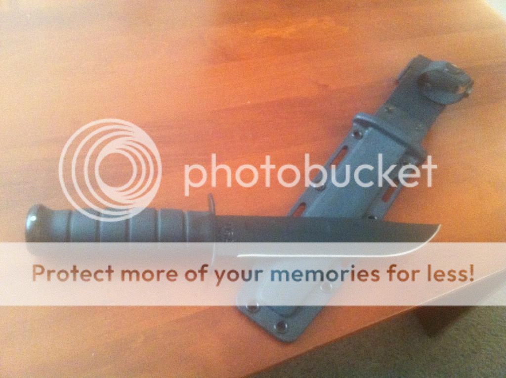 First up, the Kabar 1211. This is the iconic fighting/utility knife, but with a rubberized black handle. This is the 1211, or plain edge (no serrations) full sized Kabar. Comes with plastic stock sheath. I've never used it to cut anything. It's been sitting in my closet for a year and a half. It's brand new, never been used. $50.