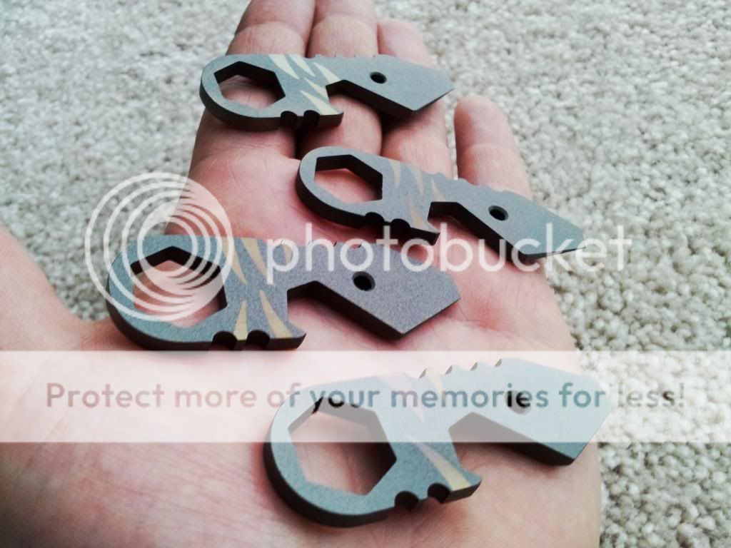 These all have nice swedges on them which both reduce the already light weight and give a little more functionality to the pry bars. The small corners, although not "sharp" could easily be used to open packages. For this particular tool I have added an anodized tiger stripe pattern.