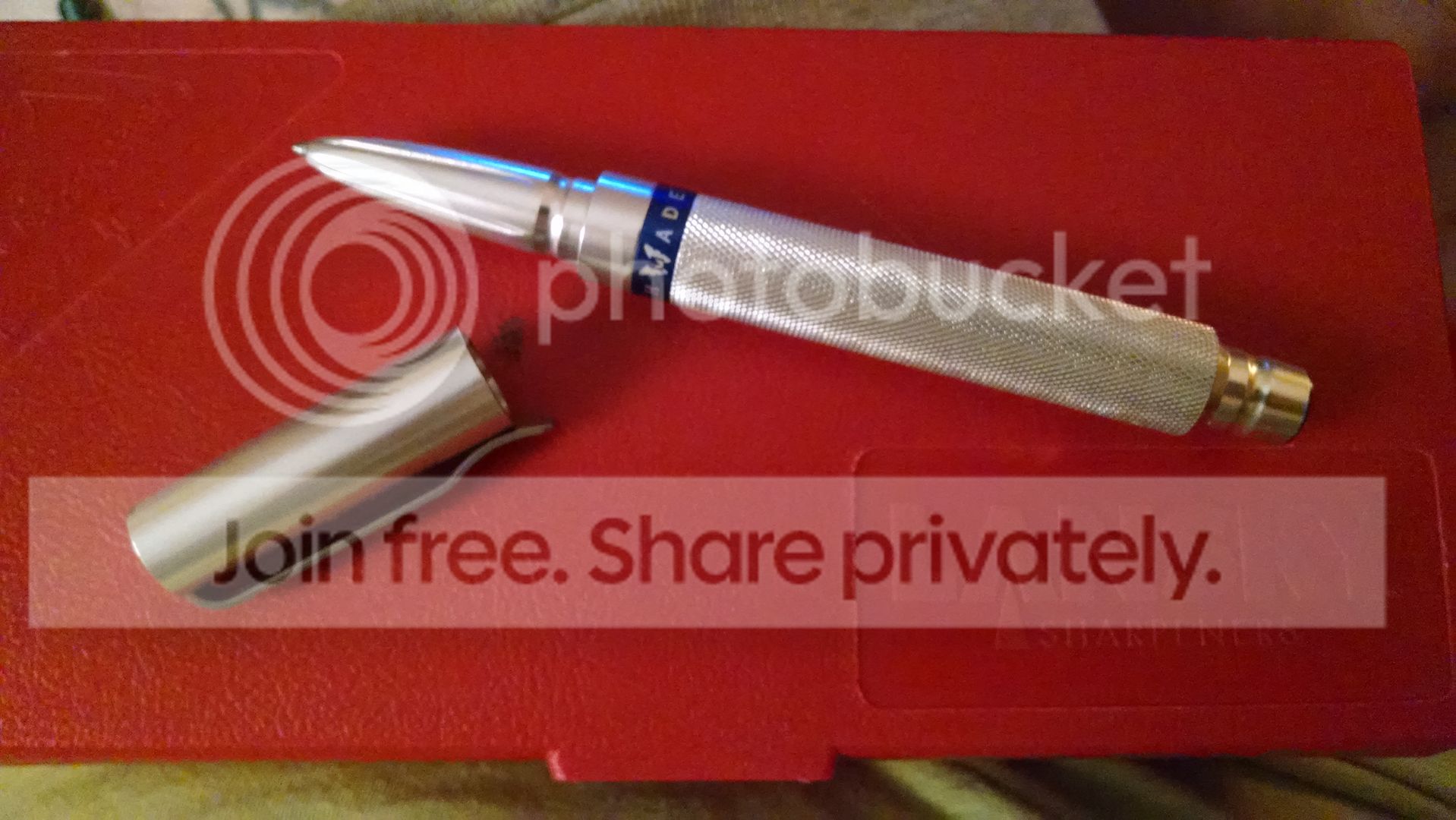 The third pen is a blue aluminum Hinderer Investigator pen with original bag, but no card. Like new no marks.