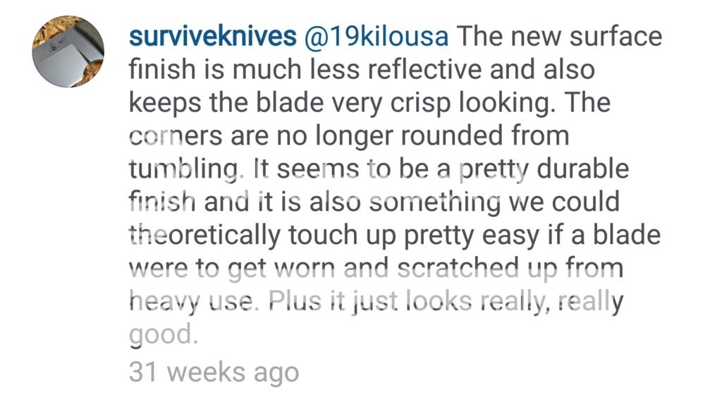 I'm not sure what it is but I would say it's blasted with some type of fine material. Maybe someone could chime in who knows.It looks awesome. What is the finish on the blade?