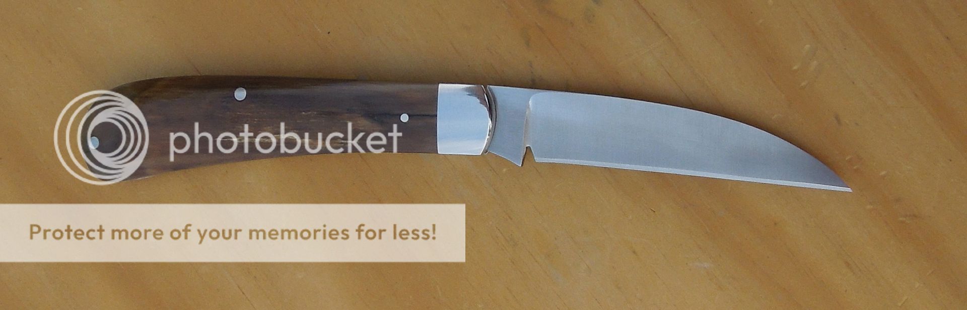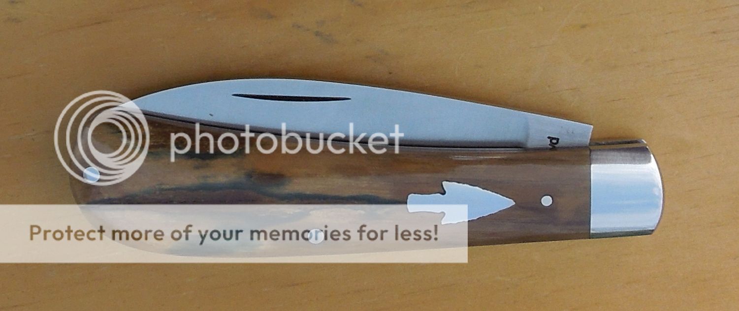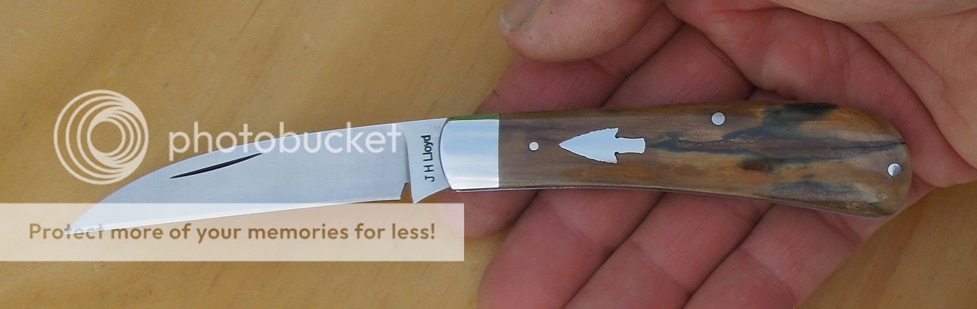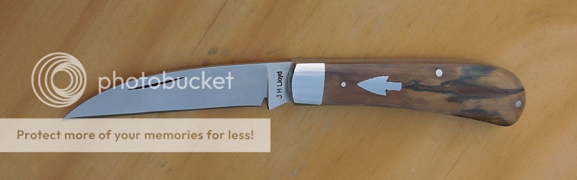 This is a trapper,or curved jack frame custom slipjoint folder by John Lloyd. It has really fantastic mammoth ivory & ss inlaid & pinned fancy arrowhead shield. Nice radiused ss bolster,ss mill relieved liners,ss pins. Very thin,deep hollow grind,wicked sharp. 52100 carbon blade & spring. Blade has a satin finish & a crescent nail pull,"punchable" , too. Outstanding fit & finish,and walk 'n' talk. The action is glass smooth,perfect medium 5+ snappy pull. Blade centers closed,spring is flush. John is just really doing fantastic work & here is a fine example. Closed it is 3-7/8" ,open,6-7/8". Blade is 3" with 2-3/4" cutting edge.