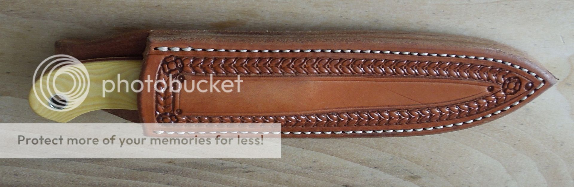 Menefee "Reno" in ivory micarta,black micarta pins ,fancy tooled sheath Paypal $360. U.S.P.S. M.O. $345.