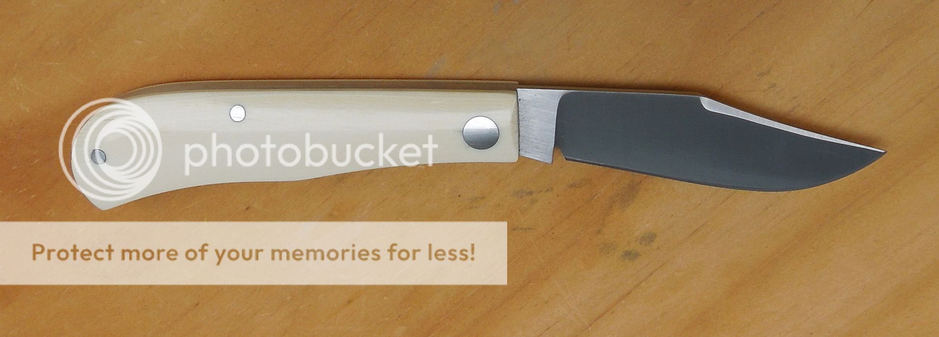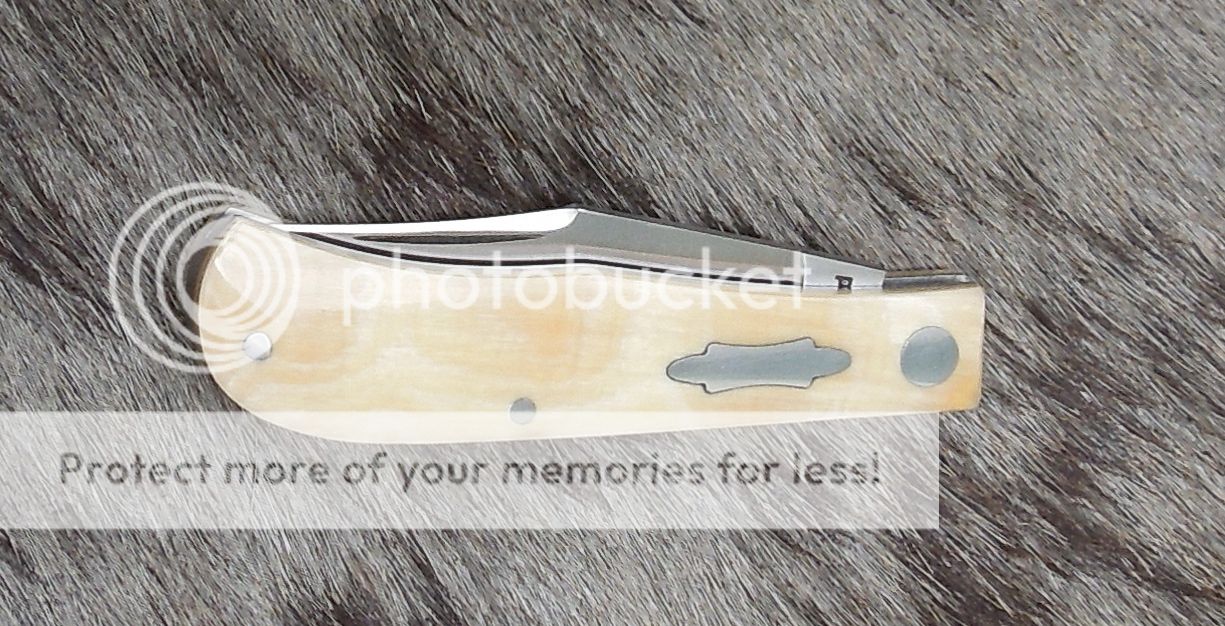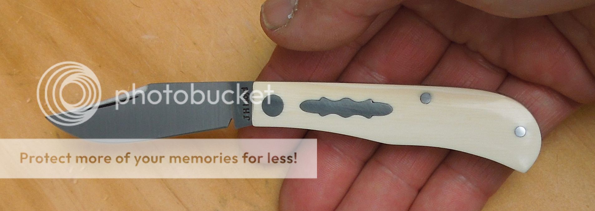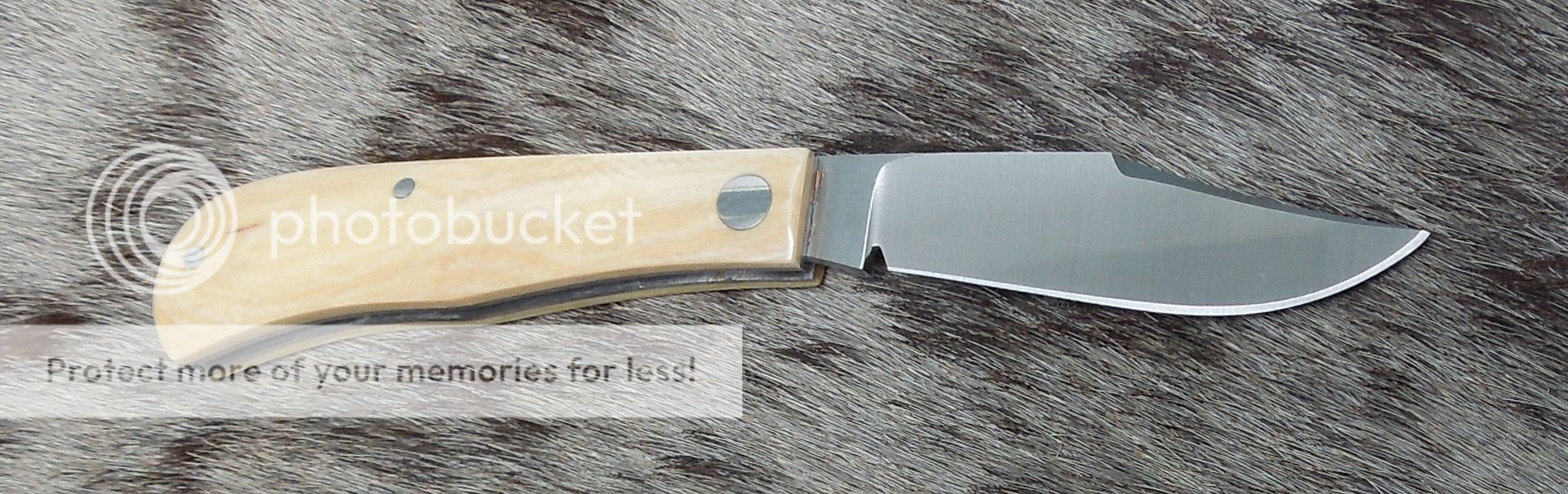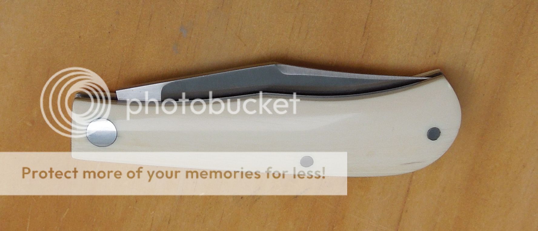 This shadow style (no bolster) trapper by John is a neat size & really nice blade profile. Goreous elephant ivory scales ,gently radiused,just perfect.3-3/8" closed , 6" open,blade is 2-5/8" with 2-3/8" of cutting edge. 52100 carbon blade & spring. SS mill relieved liners. Fancy ss shield,inlaid & pinned.Satin finish on the blade with crescent nail pull & cut swedge. Deep hollow ground thin & razor sharp. Glass smooth exceptionally fantastic walk n talk with a 5 + to 6 perfect snappy medium pull. Blade centers closed,spring is flush. Simply outstanding work by John.