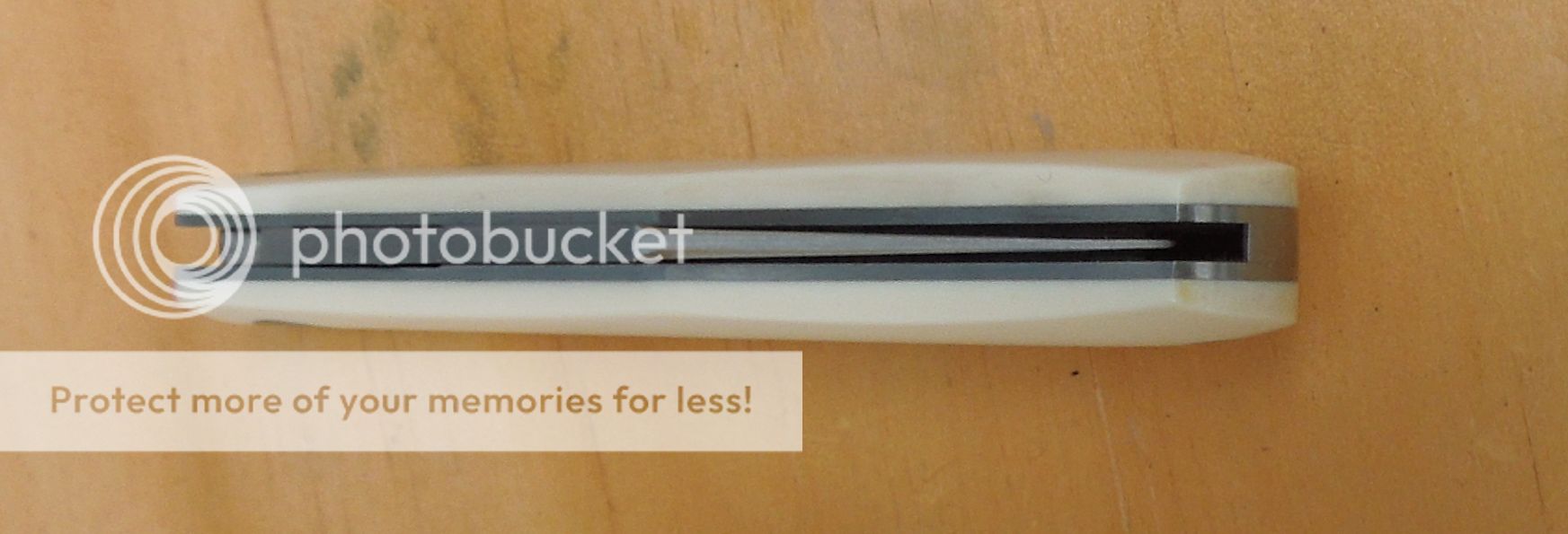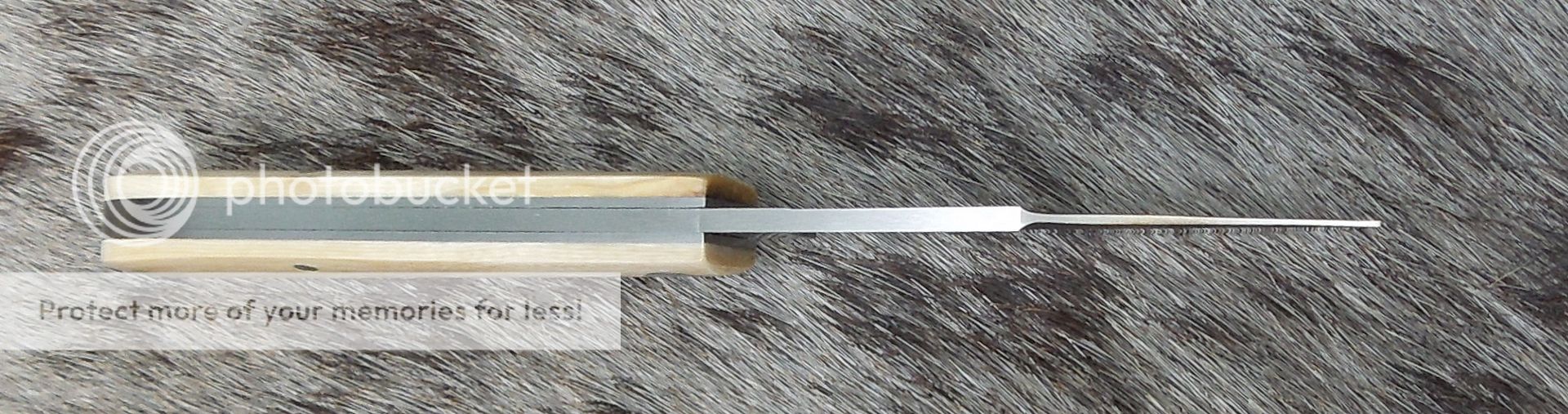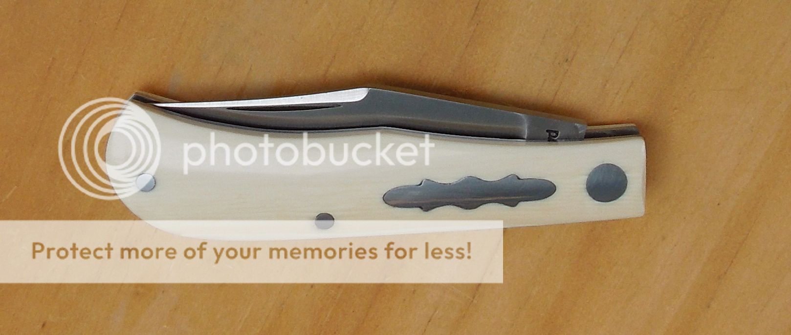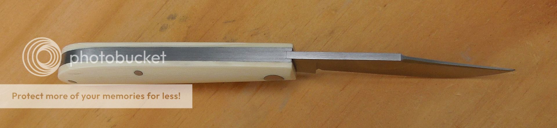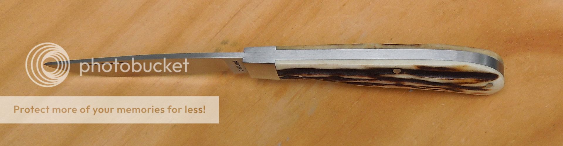 This shadow style (no bolster) trapper by John is a neat size & really nice blade profile. Goreous elephant ivory scales ,gently radiused,just perfect.3-3/8" closed , 6" open,blade is 2-5/8" with 2-3/8" of cutting edge. 52100 carbon blade & spring. SS mill relieved liners. Fancy ss shield,inlaid & pinned.Satin finish on the blade with crescent nail pull & cut swedge. Deep hollow ground thin & razor sharp. Glass smooth exceptionally fantastic walk n talk with a 5 + to 6 perfect snappy medium pull. Blade centers closed,spring is flush. Simply outstanding work by John.