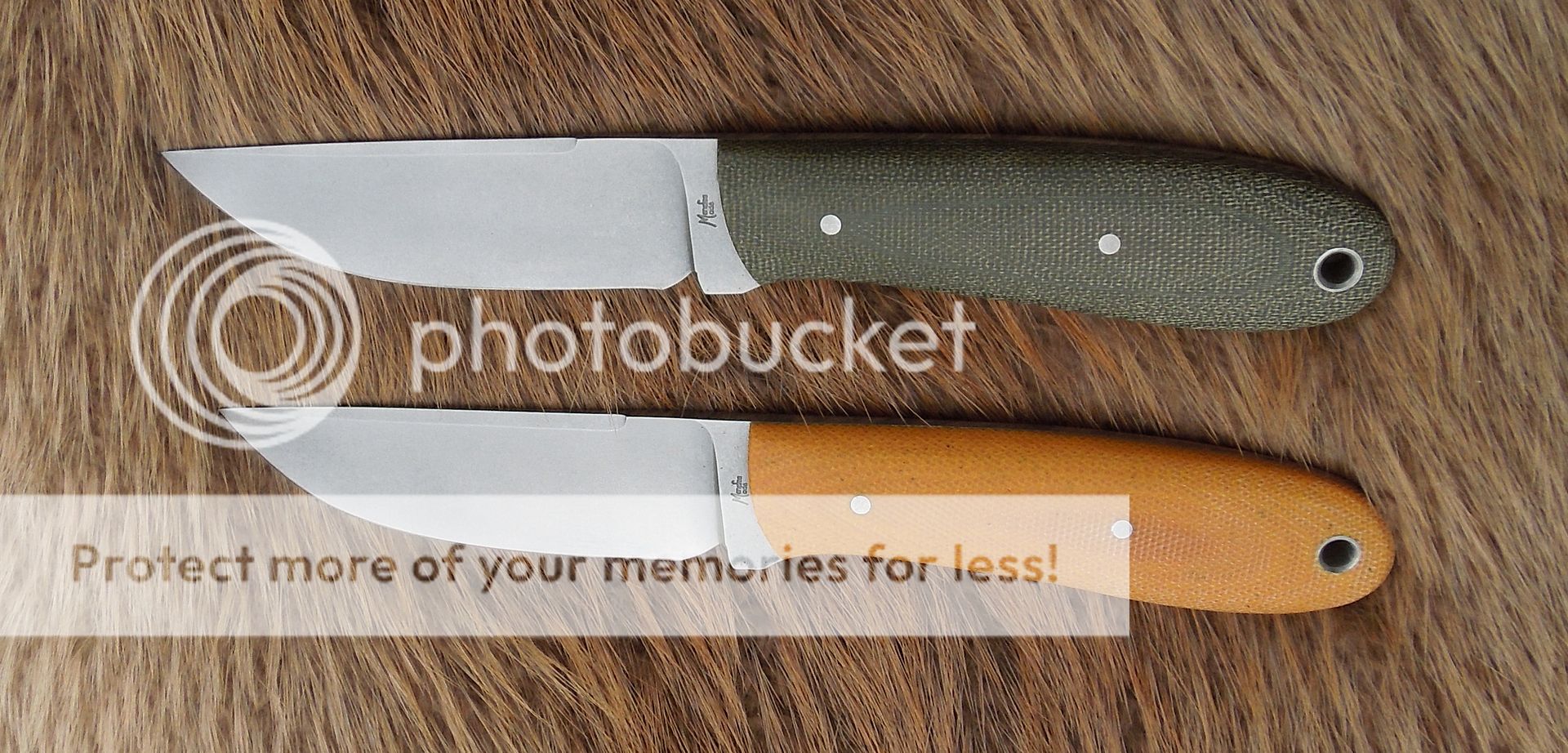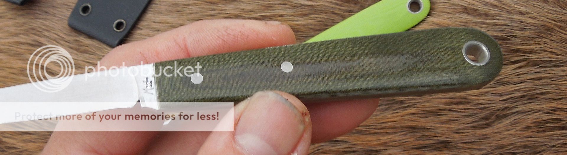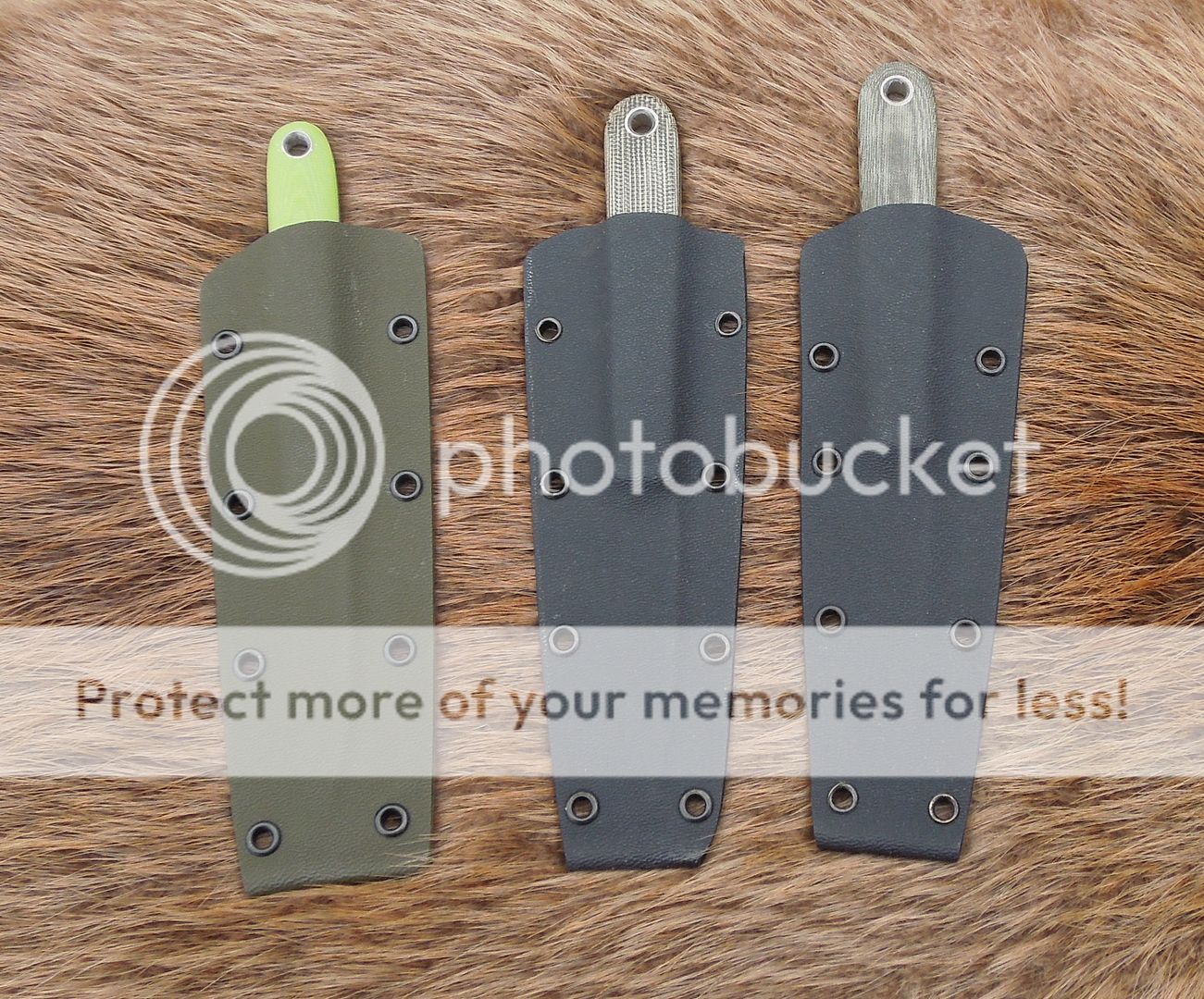 First is these 3 parer/bird knives,hunter/utility. Basic knives that can do it all. Menefee put a tumbled finish on these & started in on kydex. He's onto something here. Great work tools,this finish is grippy & scratch hiding. 3/32" thick stock. Hollow ground 154 cm ss. Green G-10 green linen & green canvas