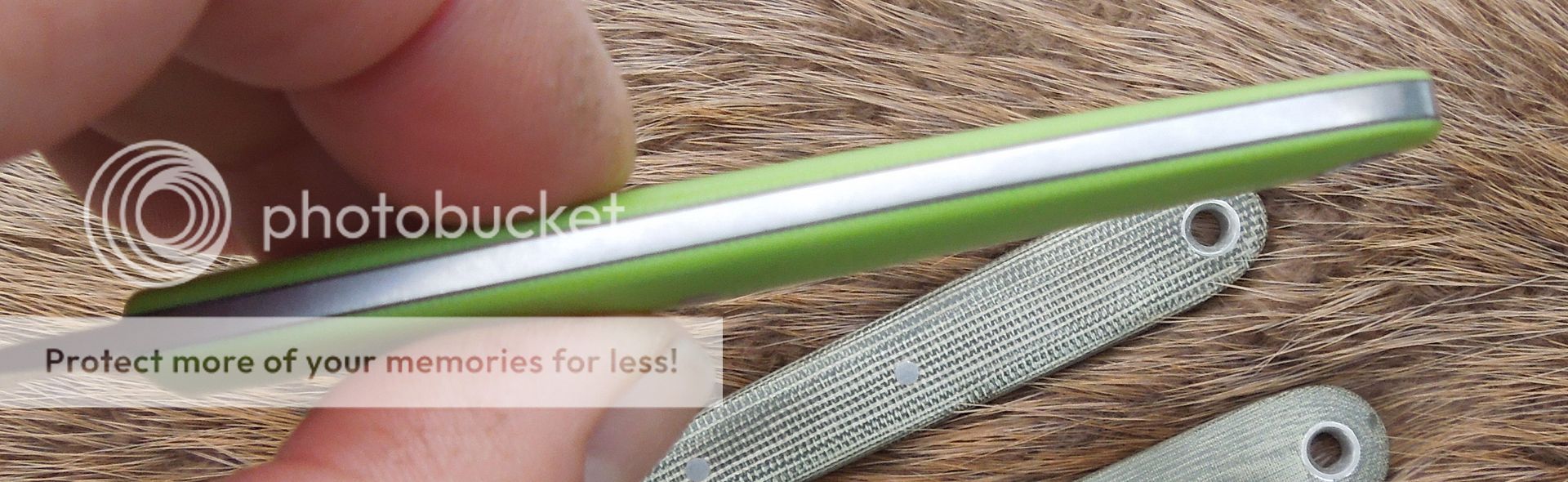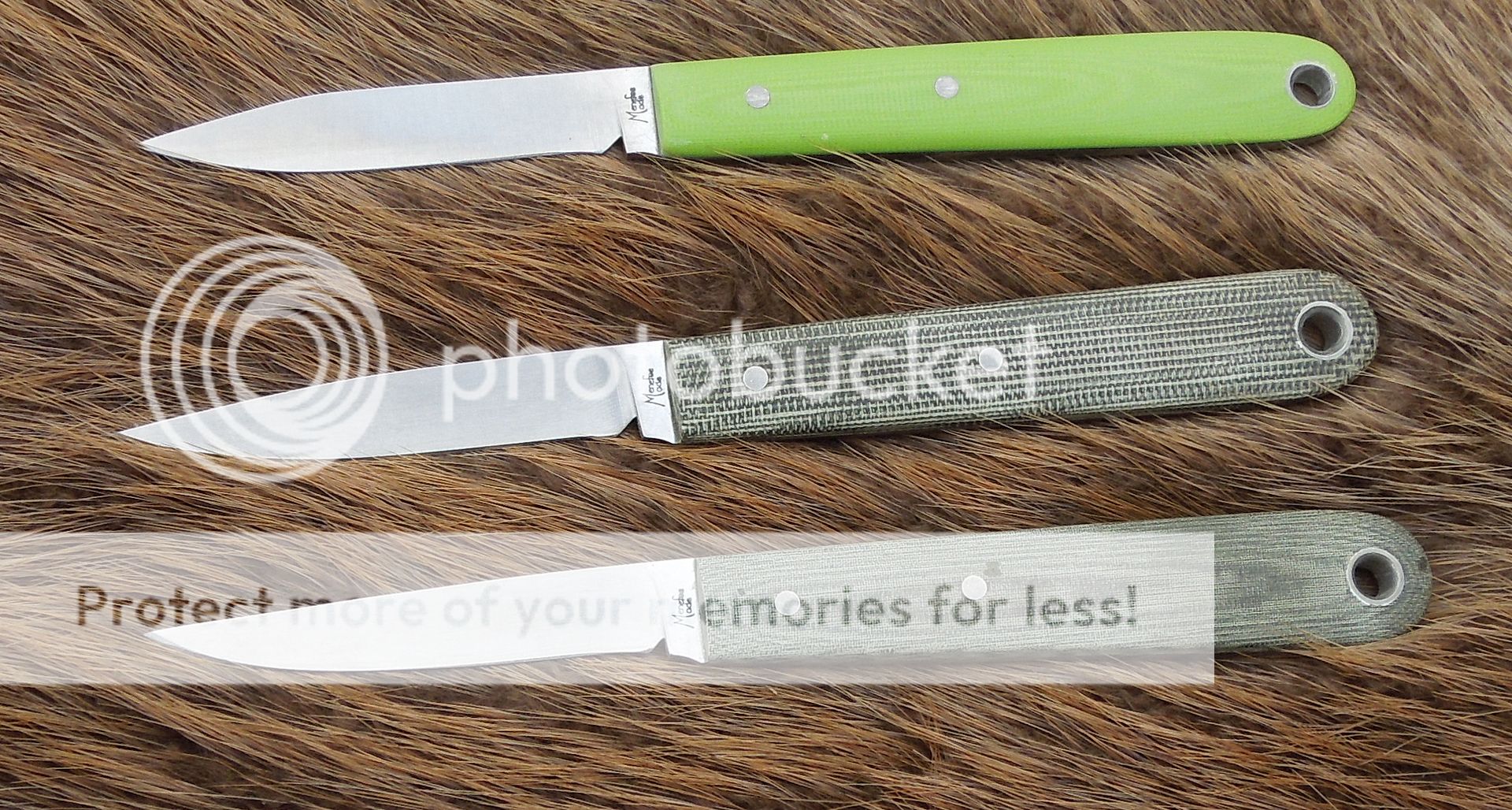 These are nice thin packages ,go anywhere. That bnrighter green one would make a great camp/canoe knife You can easily see it on the floor of the woods,or amongst clutter at the campsite