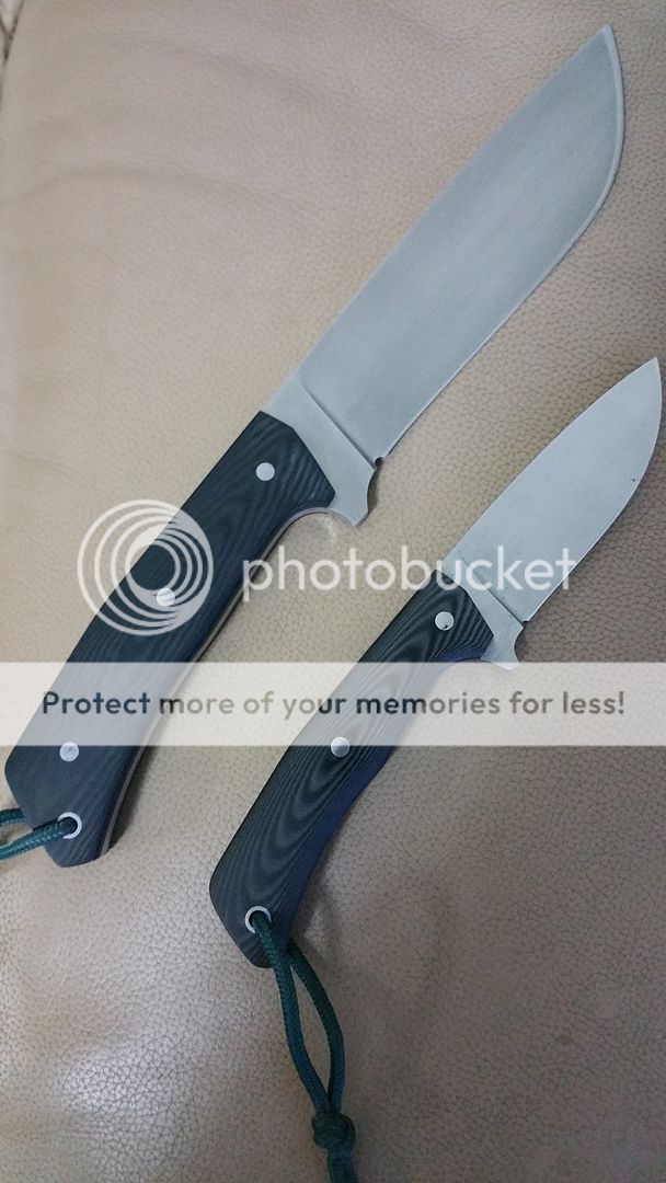 1. One-off Laconico Explorer set that I ordered from Ray years ago. Explorer- 6" blade of 5160, 1/4" thick, OAL- slightly more than 11". Never used, very slight patina spots on blade. Comes with Rays black leather sheath. 2. Mini Explorer- 3 1/4" 01 blade, 5/32" thick, OAL- 7 1/2". Has some patina spots, comes with Rays black leather sheath. Selling as a set- $SOLD