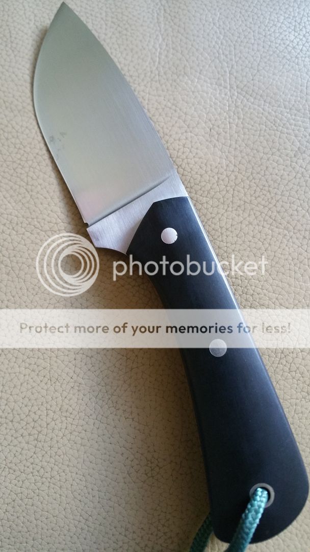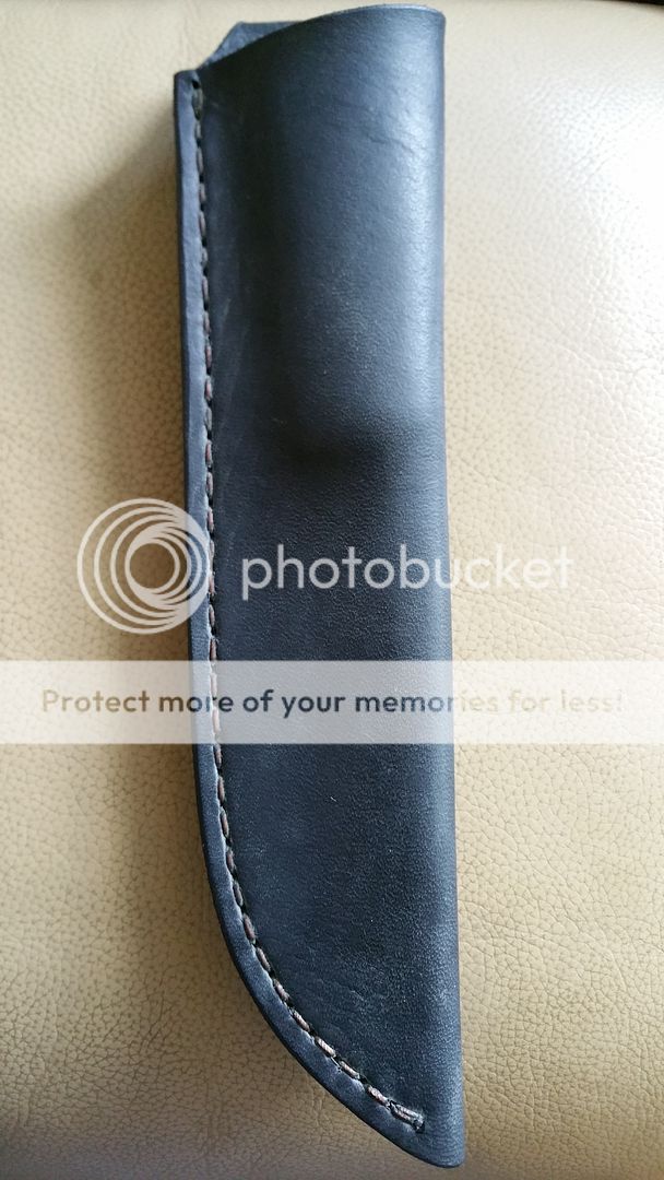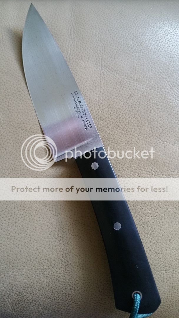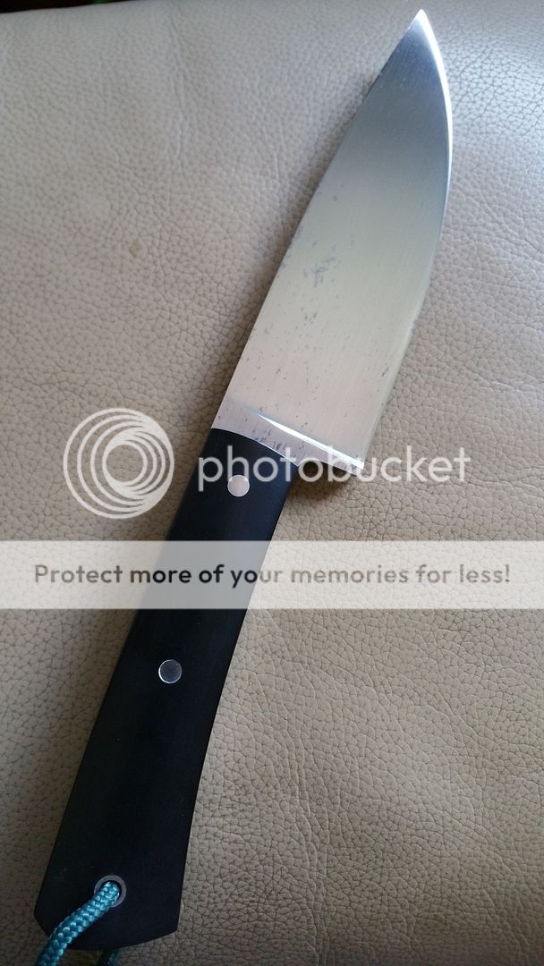 4. Camp Chefs knife- 4 3/4" 01 blade, 1/8" thick, OAL- slightly over 9". Black paper micarta handles, patina on both sides of blade, handle tang area. Comes with Rays black leather sheath. $145+3.5% paypal fees