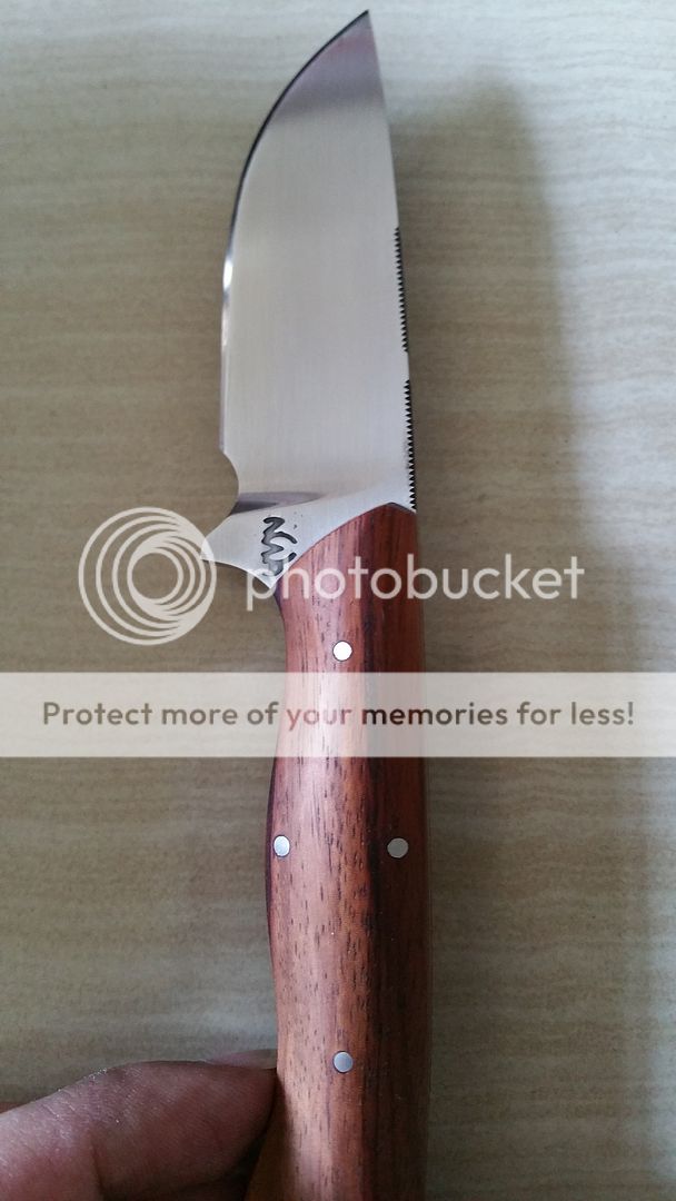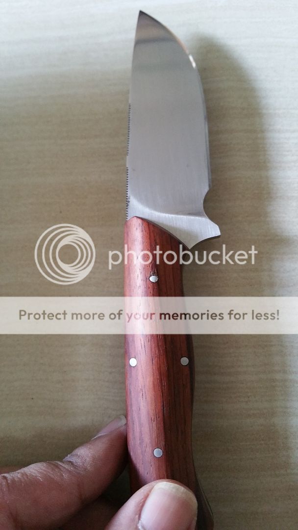 4. Stinger- 3 1/2" blade of 3/16" thick A2 steel, handle scales are of pearwood(part of the cocobolo family IIRC.) OAL- nearly 7 1/2." Never used, just couple of faint patina spots on blade. Comes with Nicks beeswax sheath made for crossdraw carry. $SOLD