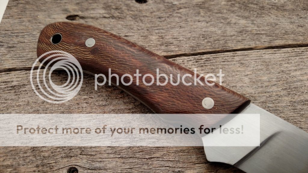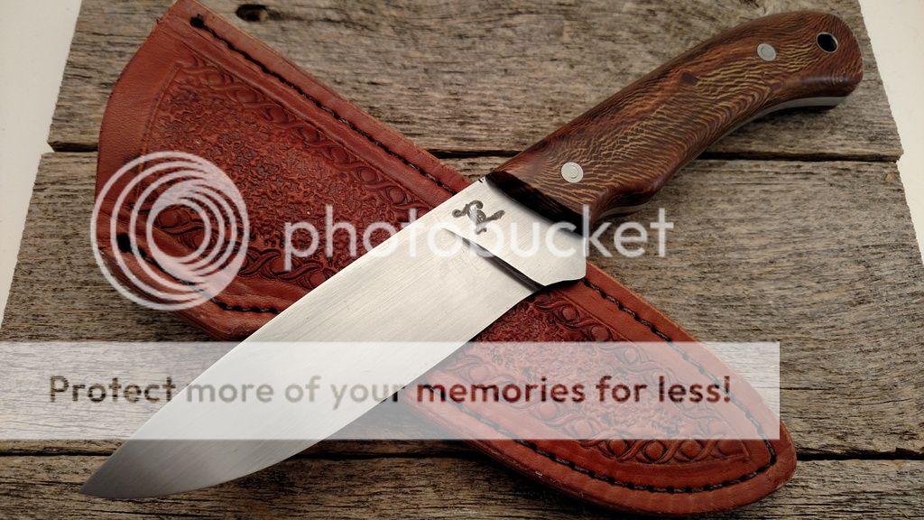I finished this knife recently. The blade is Aldo's 52100 and the handle is stabilized Sycamore. The handle has beautiful figure. It's held together with stainless Loveless screws, and has a titanium lanyard tube. The knife includes a leather right hand sheath. This knife is razor sharp!
