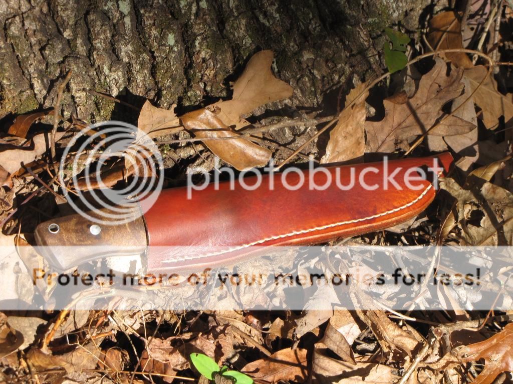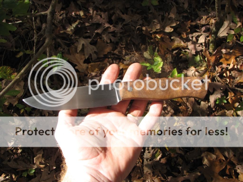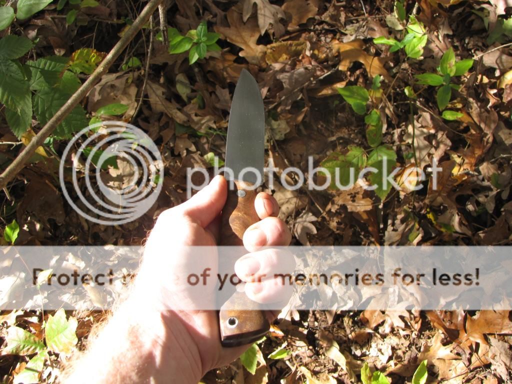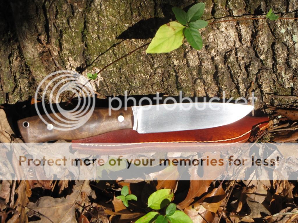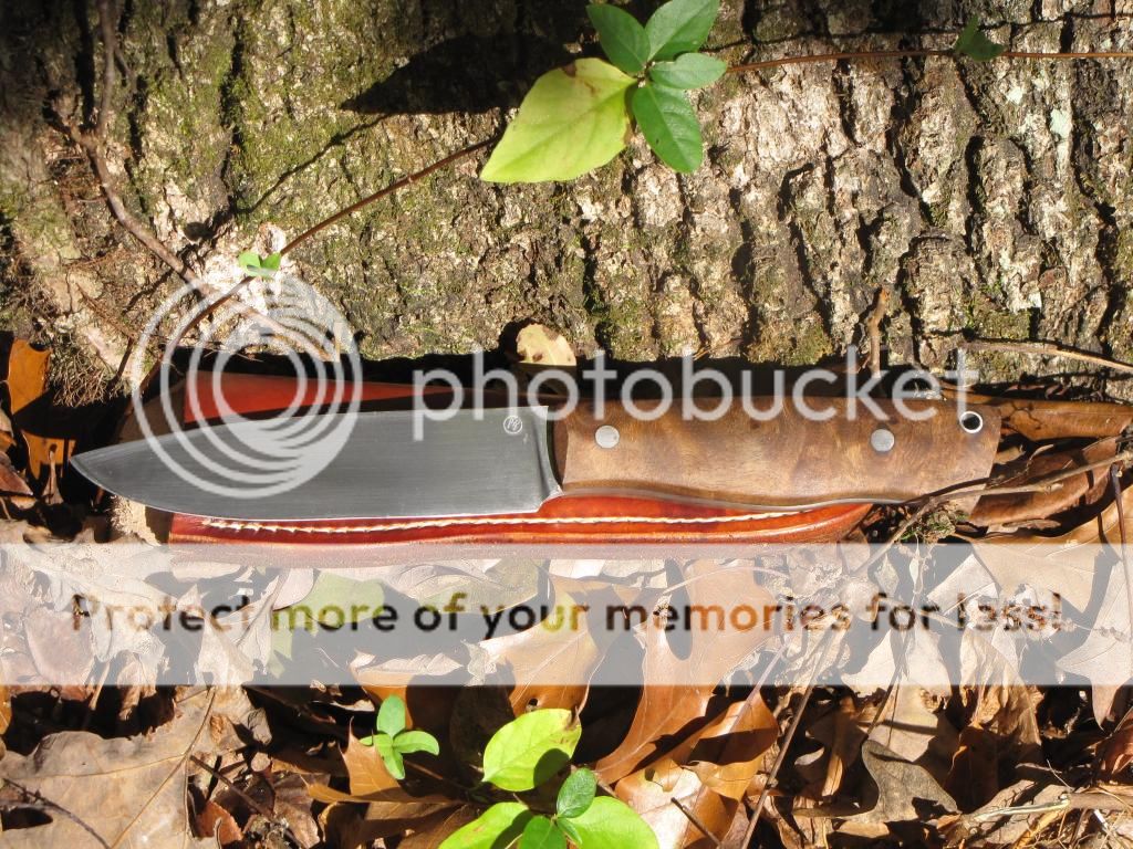 This knife is forged from 52100 the blade is 5". Handle is 4 1/2" with stabilized Thuya Burl, 2 stainless pins and a stainless tube. It is heat treated to 58-59 Rockwell. Comes with sheath.