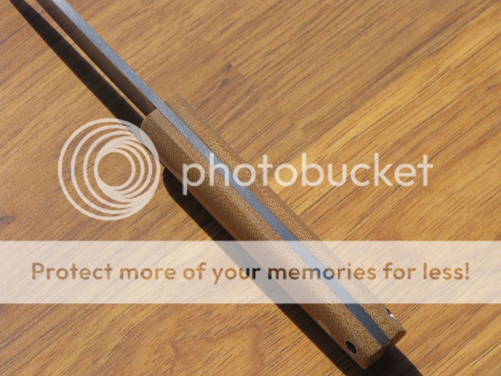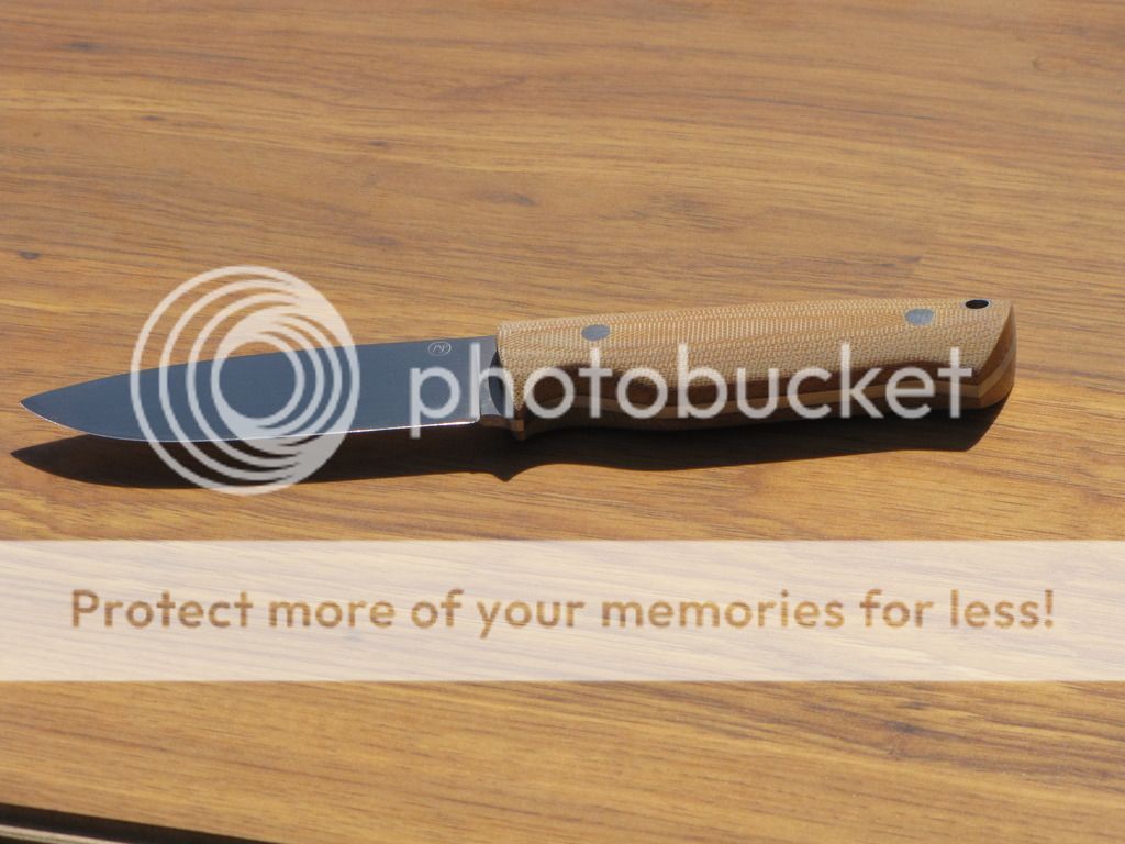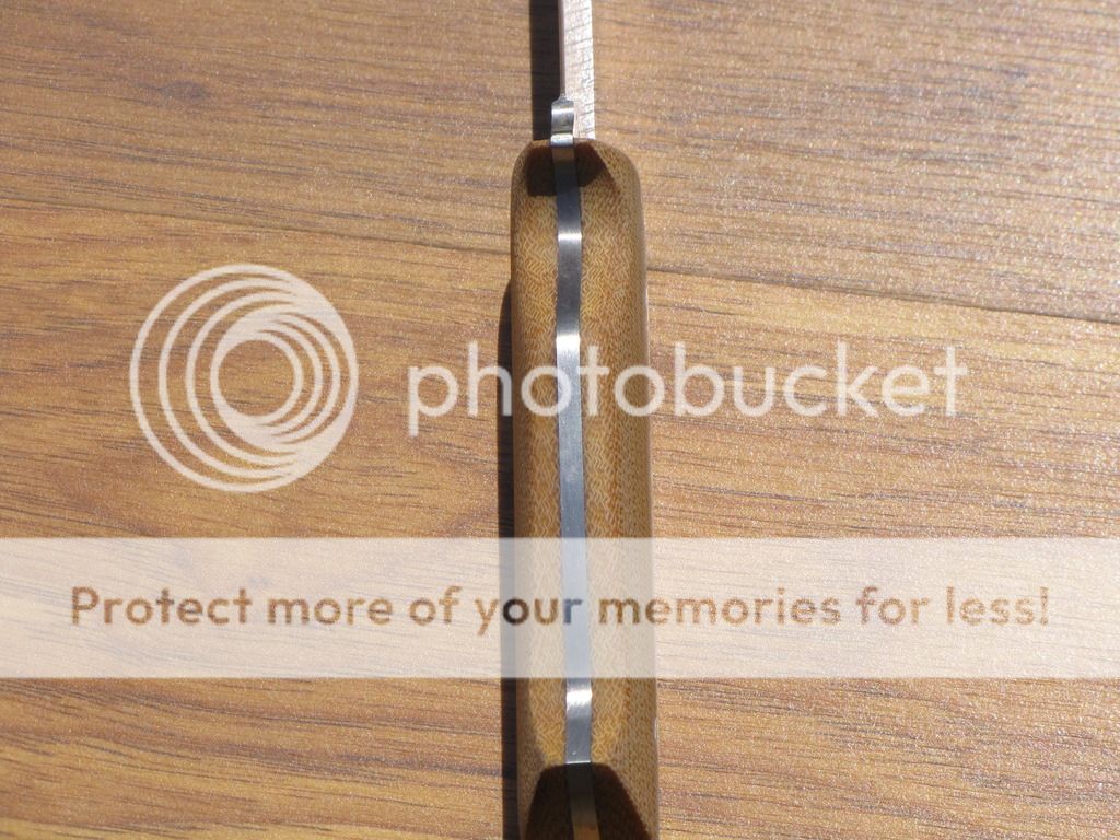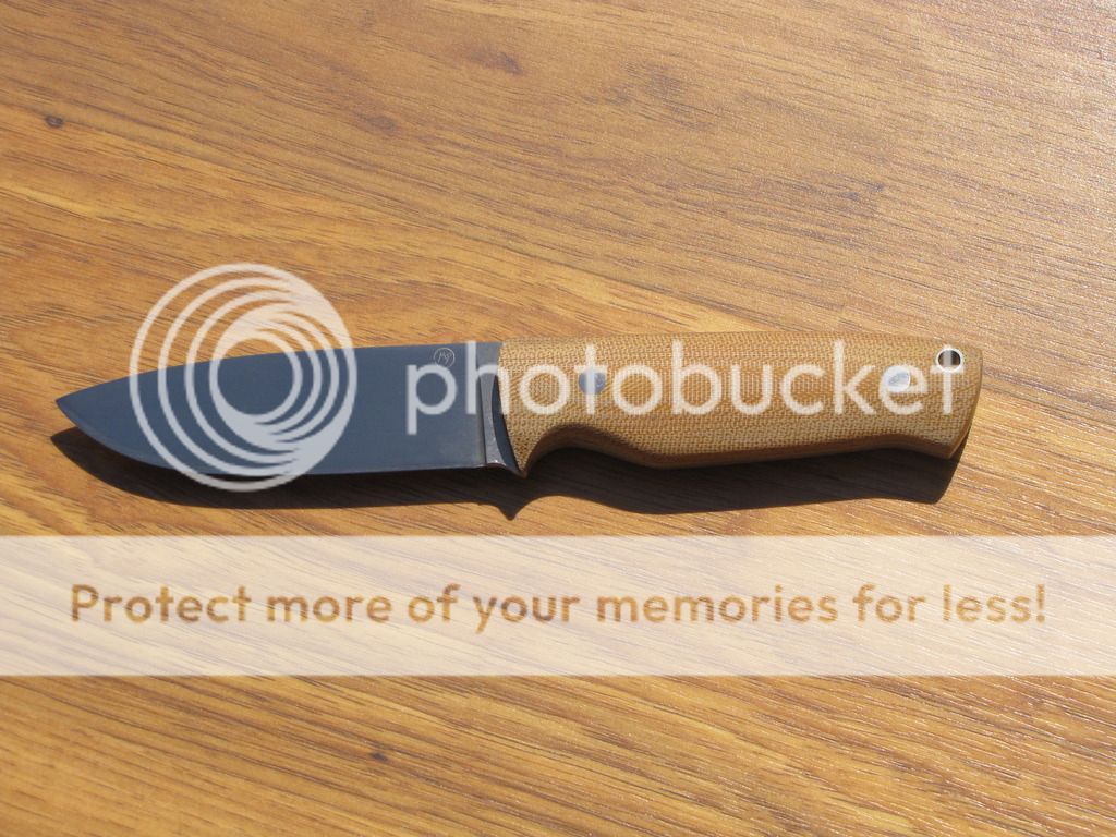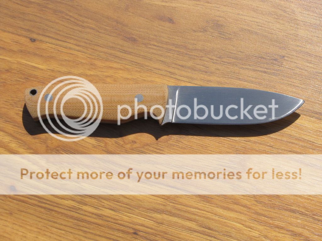 Here's a new one from 1/8" 52100. Blade is 4 1/8" and is flat ground with a convex edge. I heat treated it on site to 59-60 RC. Handle is 4 3/8" with natural canvas micarta, stainless Corby bolts and stainless tube. I am usually not a fan of a finger groove in the handle but this knife is super comfortable and easy to hold in different positions. Comes with leather sheath.