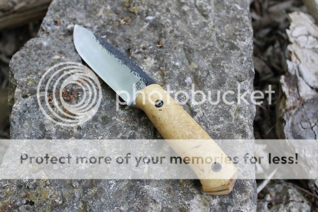 Blade is hollow ground and tang is lightened, balance point is at first pin. This is great EDC and hunting knife.