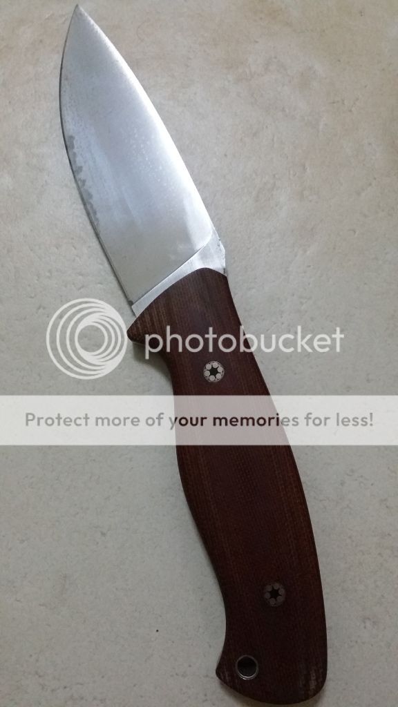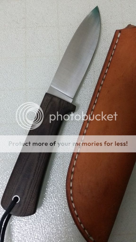 3. Utility knife- 4" 01 blade, 1/8" thick, OAL- slightly more than 9". Brown canvas micarta handles with mosaic pins. Patina on both sides of the blade from storage. Comes with Rays leather pouch sheath. Upon closer examination, I noticed a tiny nick in the edge, so will drop the price. $165>$135+3.5% paypal fees