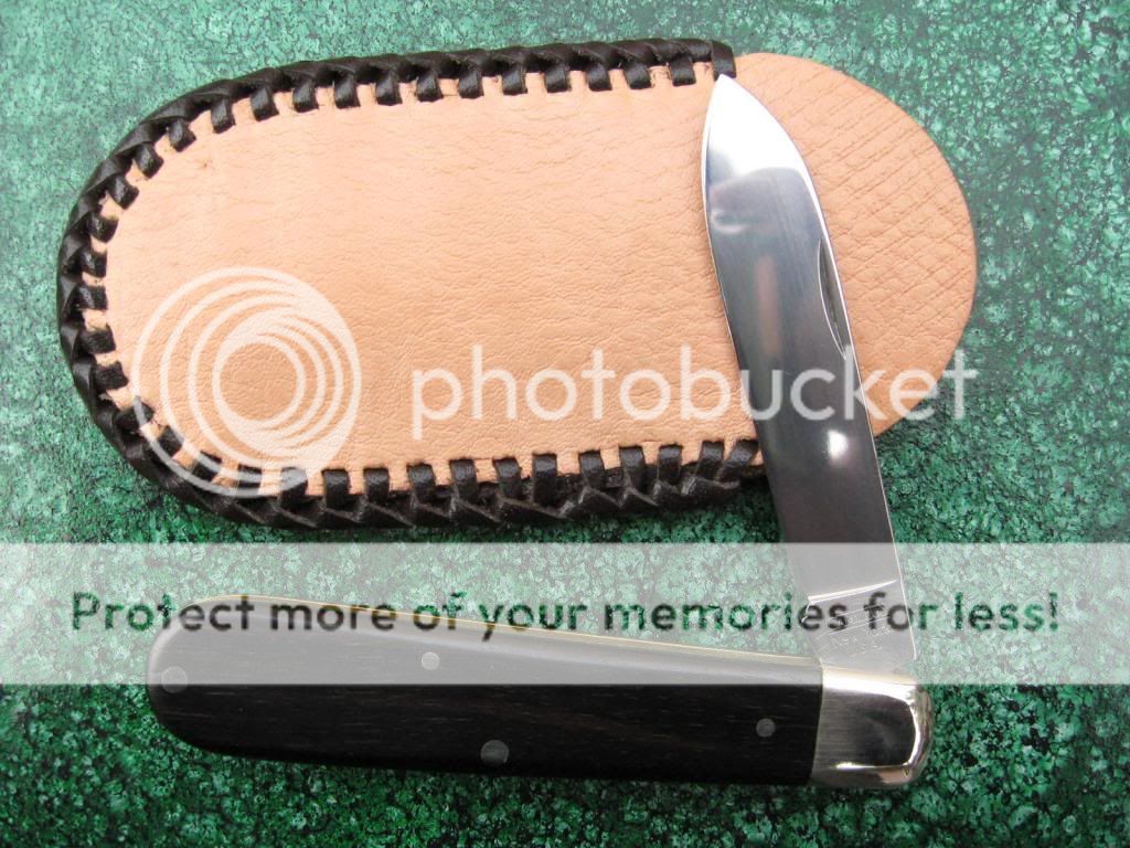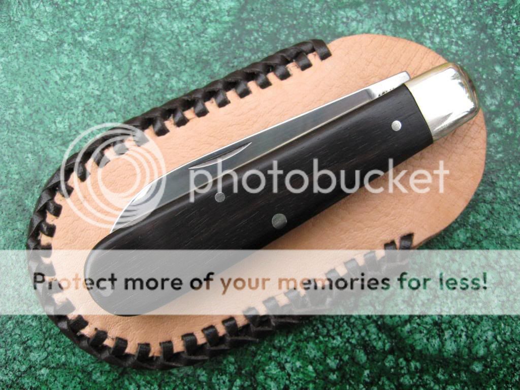 Here's the prize; a custom modified, ebony scaled, single blade TL-29 along with a hand-made, veg. tanned, leather laced knife slip!