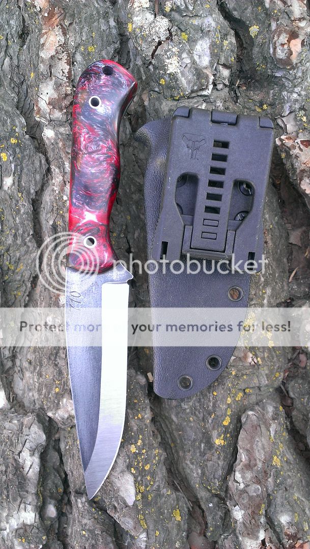 710 Warthog made with 52100 tool steel, handles are from "Beyond Wood Products" made resin materials and the colors are red, black and some gray finished off with stainless steel hardware. Comes with black Boltaron taco style sheath and large Teklok. If you prefer a leather sheath add an extra $75.00 and sheath would be a "basic" hip sheath. Asking $250.00 shipped in a flat rate medium USPS box to your door with $200.00 Insured shipping included within the USA. International shipping fees apply and fees are USPS medium flat rate box. paypal only. PM me, call or text @ 408.593.5859 and we will chat. If you have any questions please ask them. Have a great day.