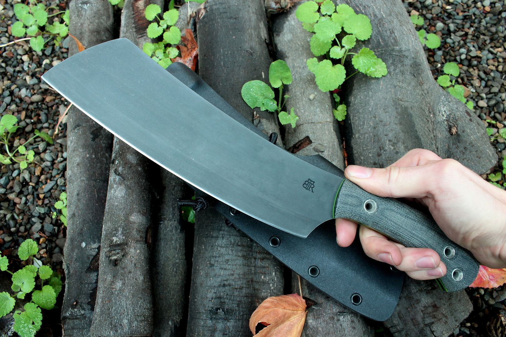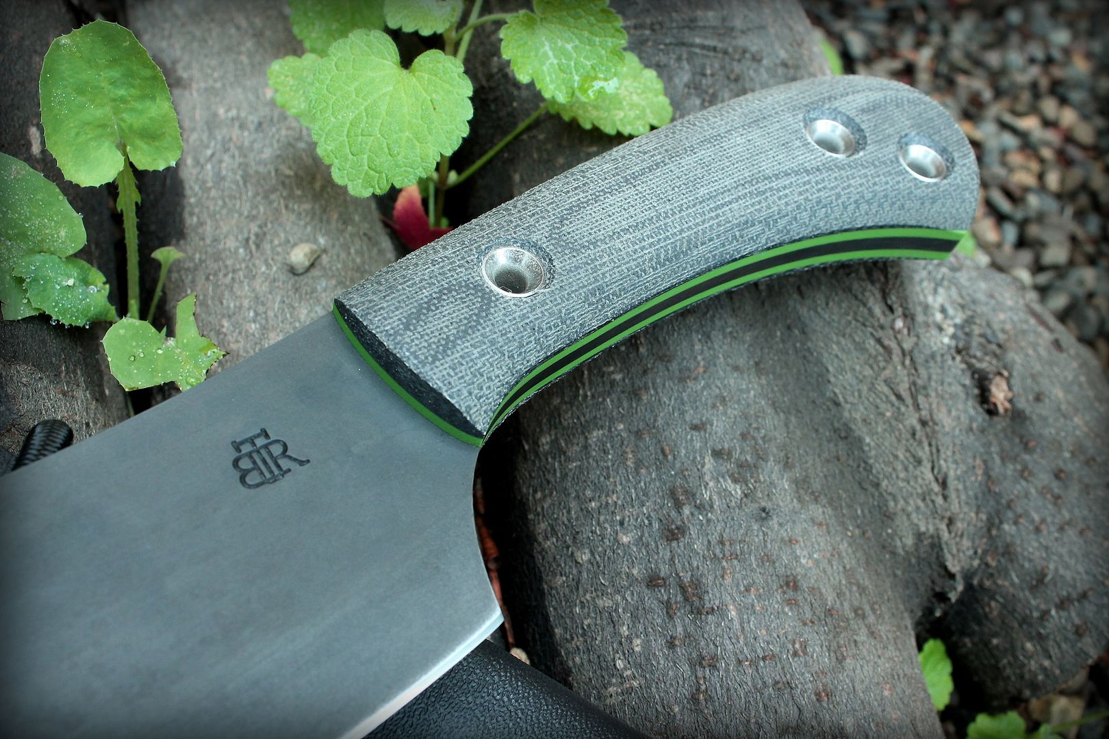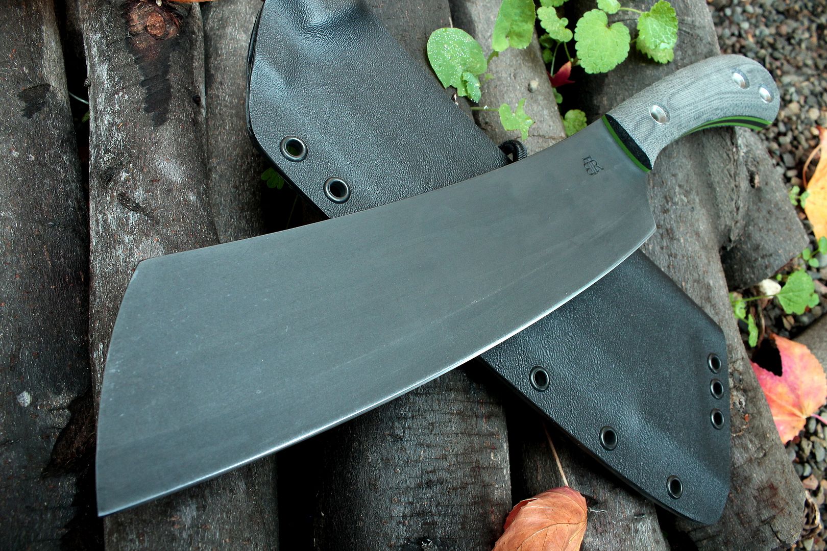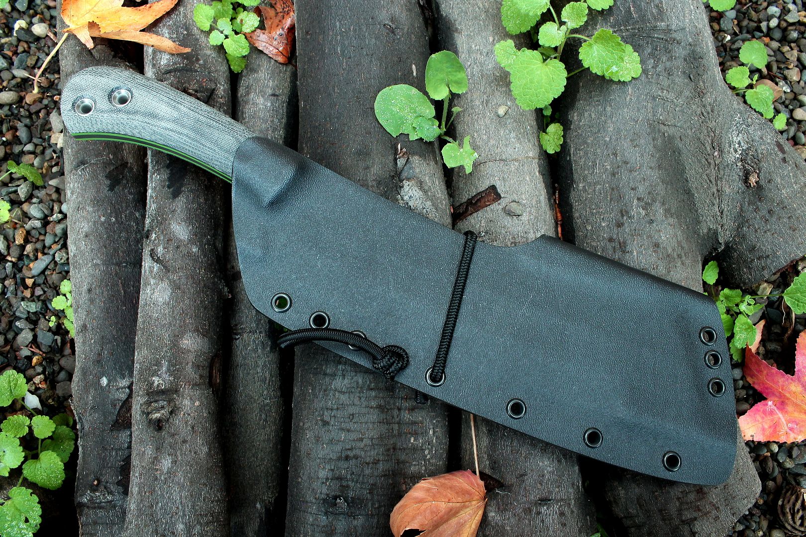 The handles are Gray Tero Tuf with toxic green liners. The scales are attached with epoxy and flared SS tubes. The scabbard is Tek Lok ready kydex with a quick release bunji for extra retention.