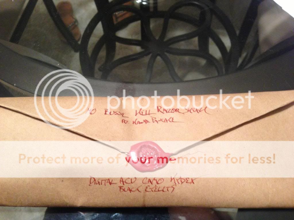 Today a special treat arrived. My Military Overrun Hell Razor Terror Monkey Busse knife arrived with some beautiful Paw Paw pants for my knife. I love how the blade handles and how it feels. I'm already blown away and I haven't even used it yet. Great Job and thanks to everyone at Busse and Paw Paw. Here are some pics: