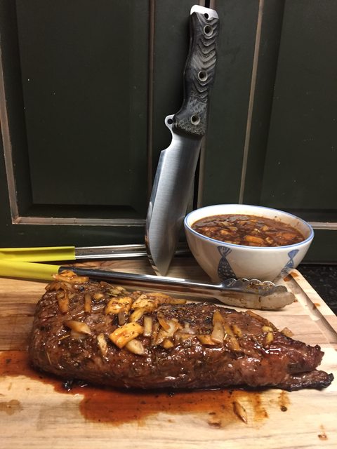 Cooked - it was warm in the middle, could have left on grill for another 3 minutes, I boiled the marinade (korean bbq sauce, garlic, Worcestershire, 2-pepper hot sauce, cajun trinity, herbs de provence/oregano, slap ya mama, sriracha, sliced onion, pineapple shavings, more spices, and some cayenne and some black molasses) for a dipping sauce and glazed the meat with it in the grill. there was a cut down fat cap on the underside that tasted like heaven with the caramelized and blackened flavor of the marinade - it was a nice contrast to the rareness of the meat. It was windy and I never cut a piece of meat while cooking and I usually get it just right, it was still relish, and I ate about half of the thing in 3/4" slice-chunks hand to mouth over the cutting board while dipping...