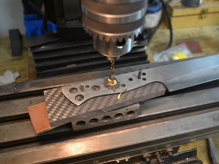 Yanagiba! Drilling with a backer so I don't blow out the back of the CF. This material is made in the USA by Ghost and is aerospace grade... top notch material.