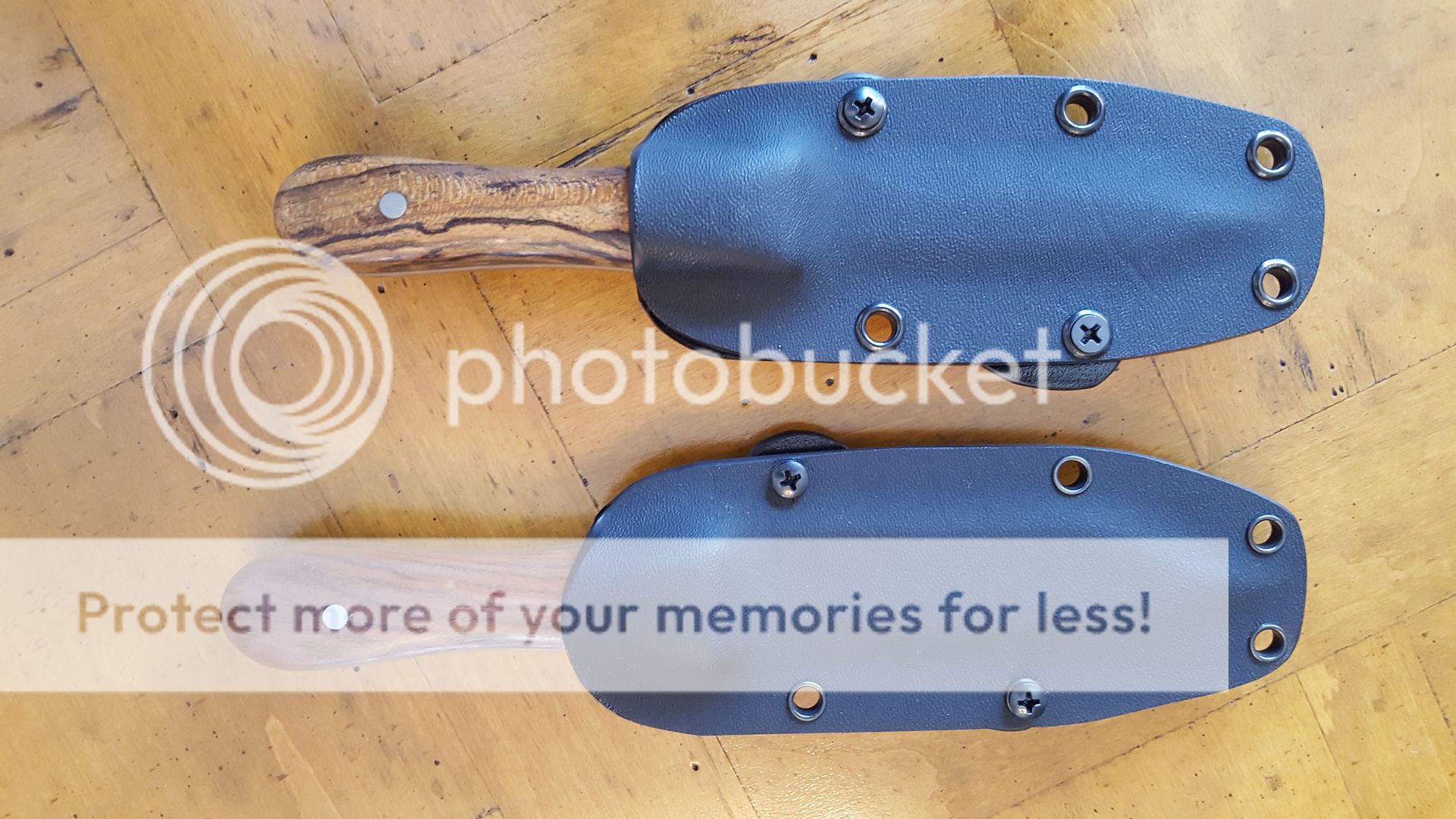 About the knives the dagger is 7.75 inches long and sports a 4 inch double edge blade. The Bowie is 8.5 inches long and sports a 4.75 inch blade. Both are made from Aldo's 1/8 inch thick AEB-L and as I stated right around a Rockwell 61 both are about an inch in height and are mirror finished. The top one has scales made from Chechen the bottom one from Bacote both handles are about 4 inches long and 3/4 inch thick at their widest. They both come with custom Kydex behind the back sheath (modified scout carry) that fit between the belt and the pants in the small of your back. Drop your T shirt over it and the disappear. They are also set up so they can be drawn weak or strong arm. Just change the loop on the back.