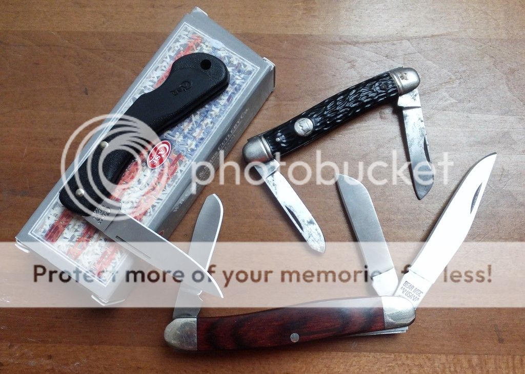 Lastly is a lot of 3: First is a Bear mfg rosewood stockman. Appears used but not sharpened. Sheepsfoot blade has gritty action. Case 059l small lockback with box. Used and sharpened. Lastly a 2 blade clamshell imperial. No tang stamp, single spring. $23.00 for the lot