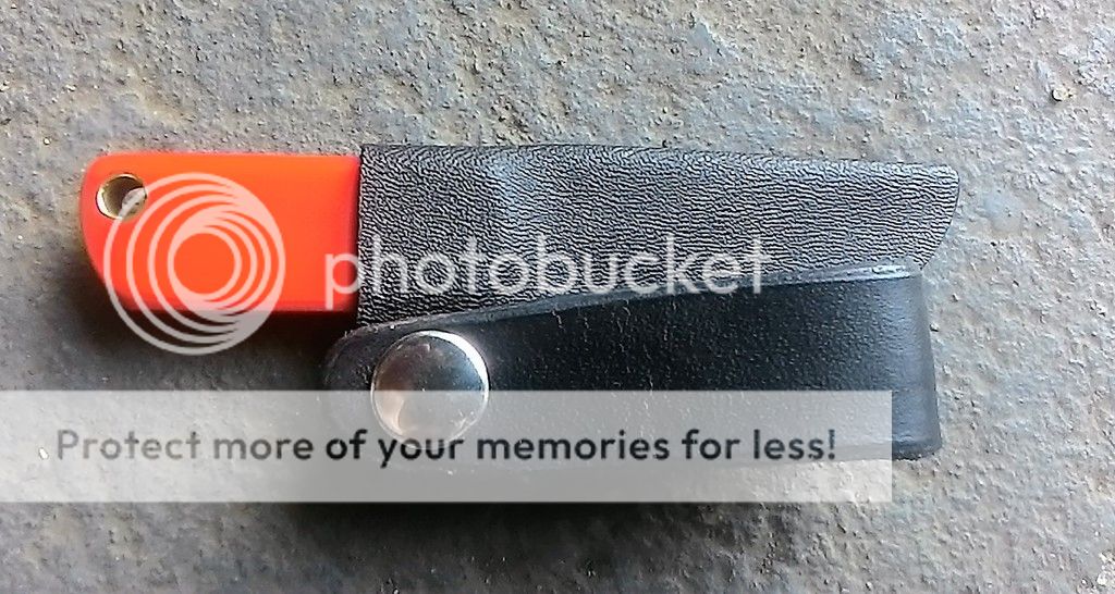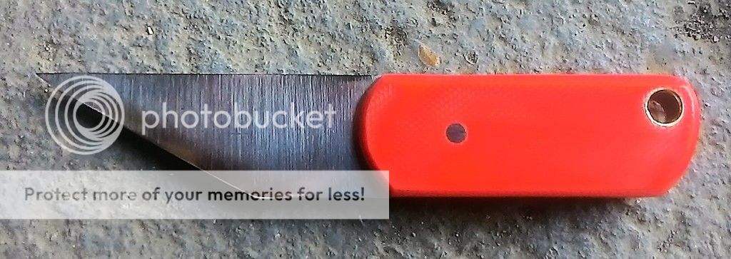 Orange concealed carry Kiridashi is made from 15N20 carbon steel. Its blade is ground with a right side chisel grind. The handle is made from orange G10 with a stainless pin and brass lanyard tube. It comes with a black kydex belt sheath.
