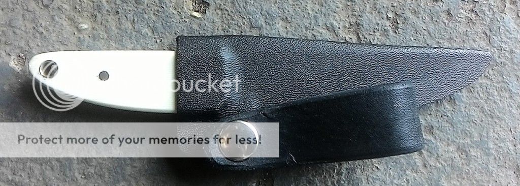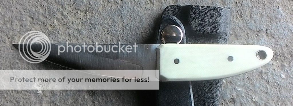 Next is a nice concealed carry Kwaiken. The blade is made from AEB-L stainless and is ground with a double hollow grind. The handle is made from Ivory G10 with stainless pins and brass lanyard tube. It comes with a black kydex sheath.
