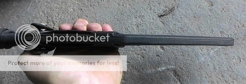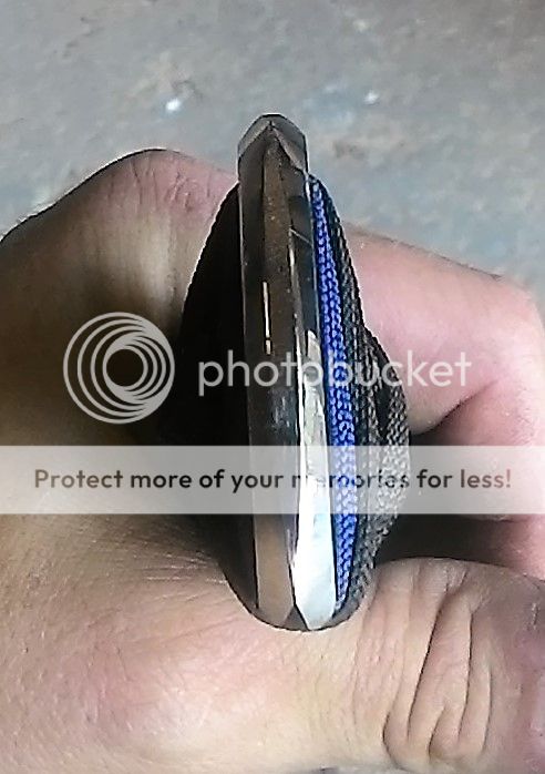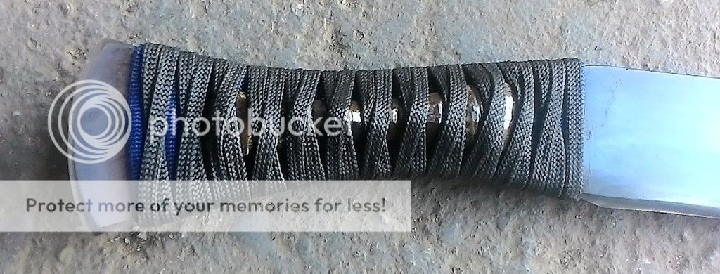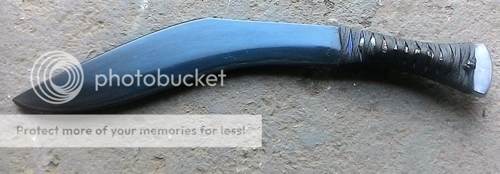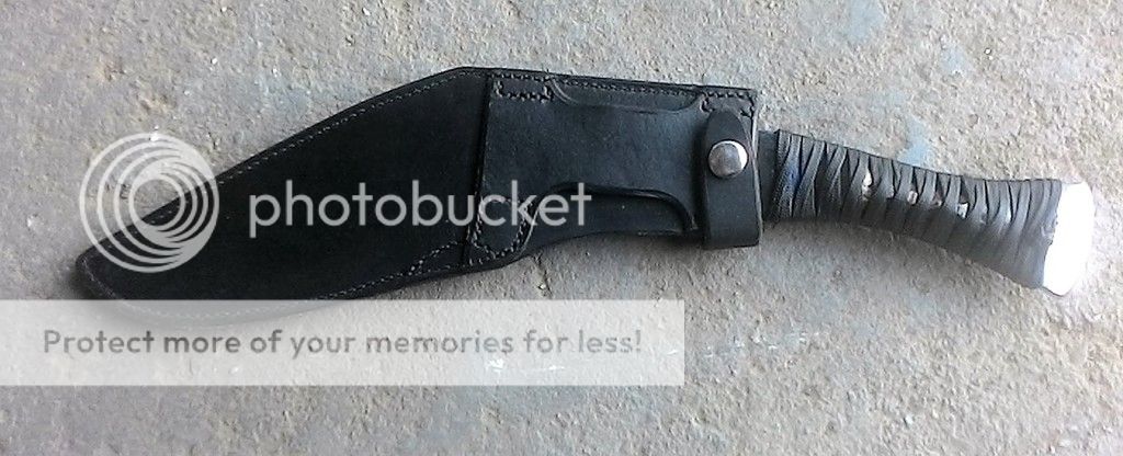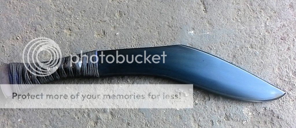 Up first is a kukri made from 1/4in 1095 carbon steel. The blade is ground with a double convex grind. This blade has good weight to it and feels great in hand. The handle is made up of blue and black paracord with bamboo fillers. It was soaked in West marine resin. The blade has been cold blued. It was heat treated in my Paragon oven and is tempered to be in the hardness range of 58-59RC. The is made from black leather and has an oak filler in the bottom for worry free drawing.