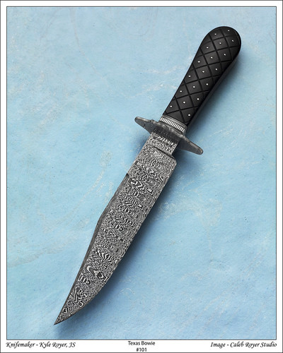 Here is a little bowie I made for San Antonio. I'll be heading there tomorrow. The 6 1/2" blade is a W Ladder Pattern. The handle is ebony with cross hatching and 36 domed tacks. The three piece spacer is of fine ladder damascus and stainless steel with grooves and coining. The guard is sculpted ladder pattern damascus. Let me know what you think.