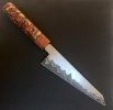 A k-tip gyuto with a colorful stabilized wood handle contrasting with the stainless clad, hand rubbed blade.