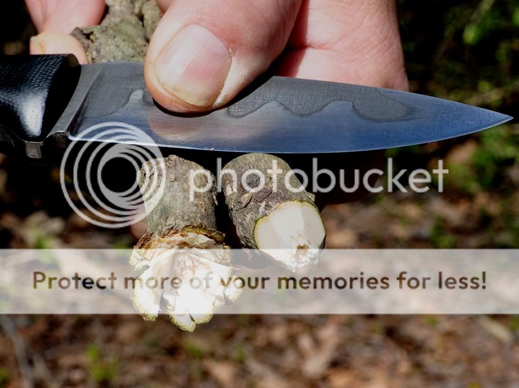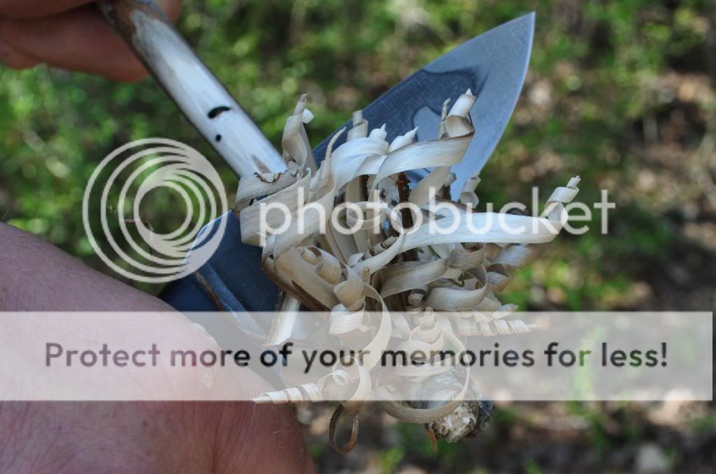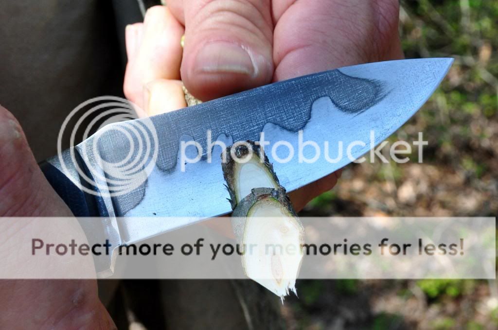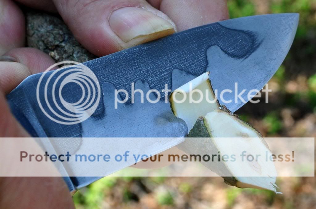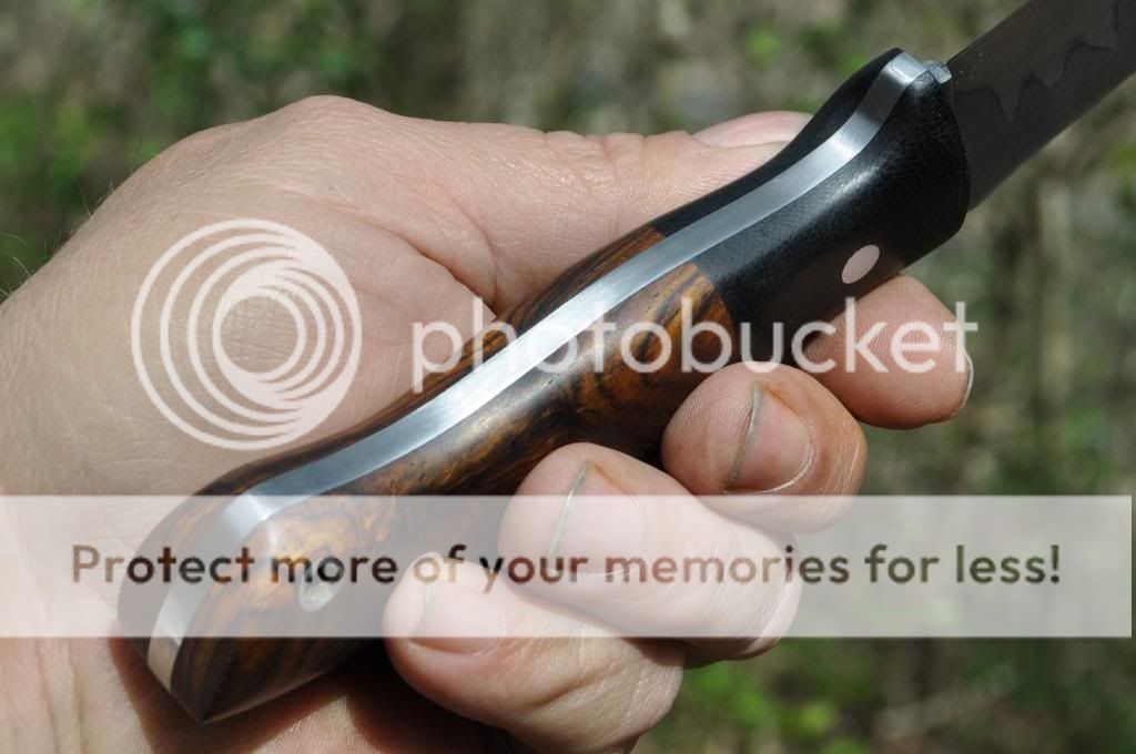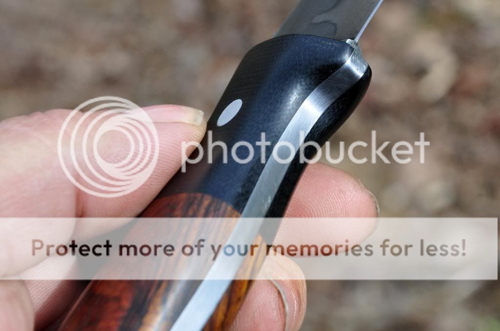 The knife has actually seen a lot more use than is represented in the photos here, and I have found it to be very comfortable in use over long periods with no hot spots that I have found so far. The handle is nice and smooth, but contoured for a secure purchase. The balance is just behind the first finger so just a little handle heavy, which is actually fine for me for a knife for more utilitarian type uses, but once he starts tapering tangs he's really going to be onto something! I am not sure what the RC is on it, but it has held an edge well through a good bit of cutting and whittling, and showed only minimal damage from several strikings of fire steels. What damage was done was pretty easily taken care of with a small stone in the field. All and all I really like the knife a lot, and am really happy with Matt's workmanship. I will definitely be keeping a close eye on his work in the future and look forward to watching him progresses in his craft.