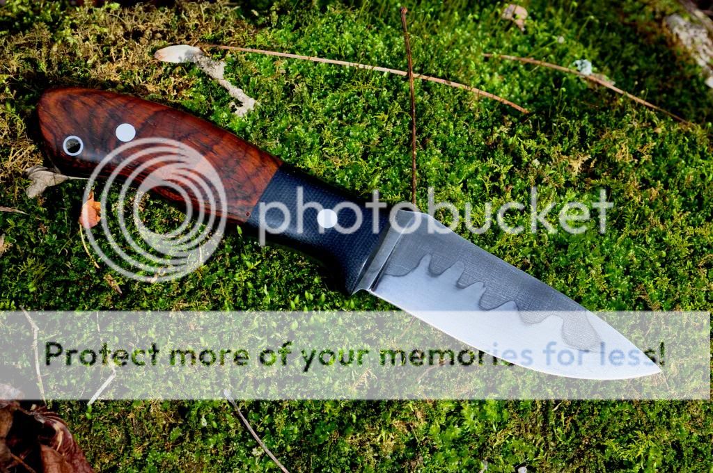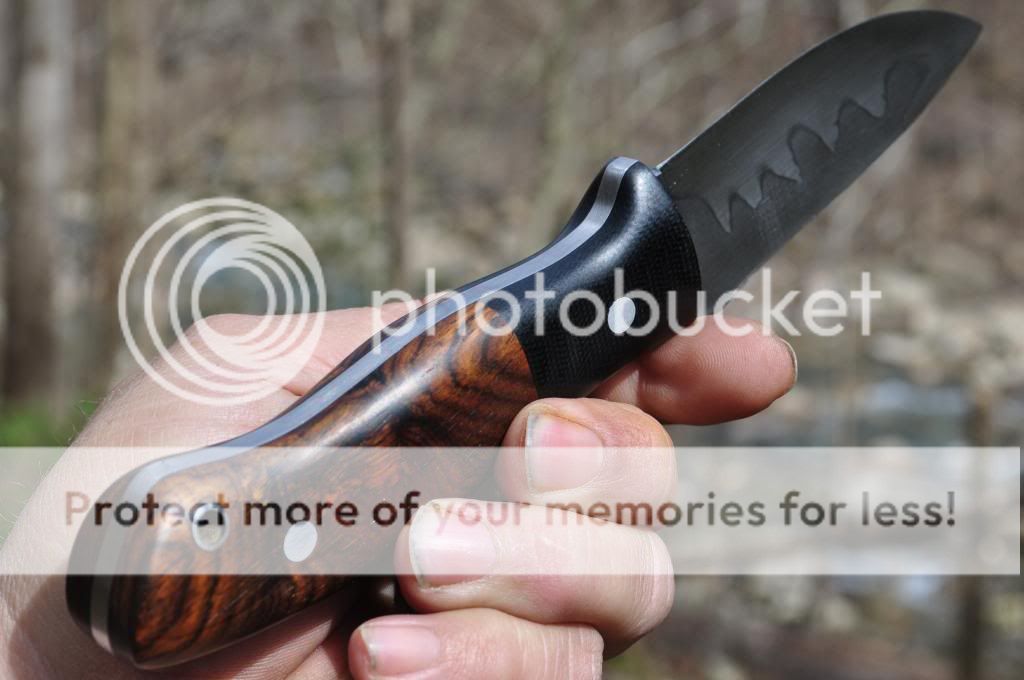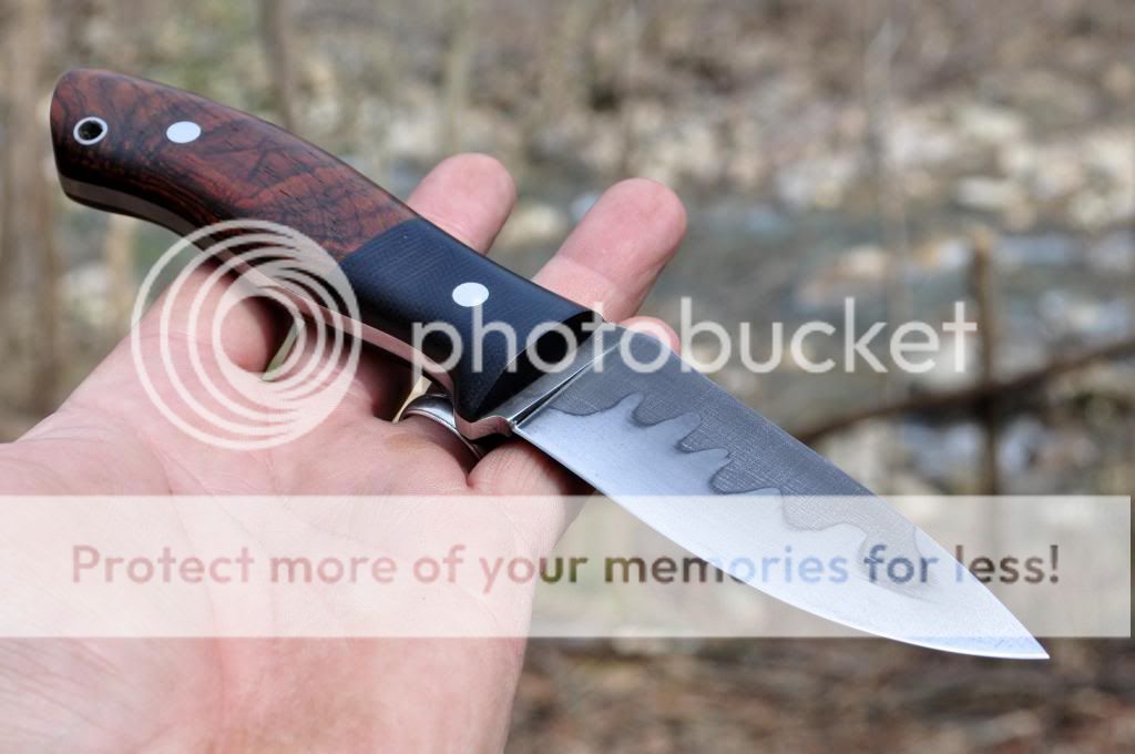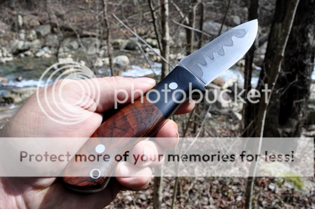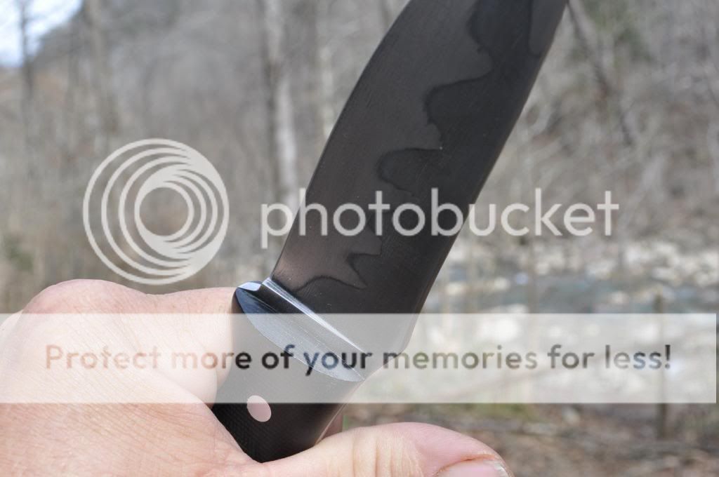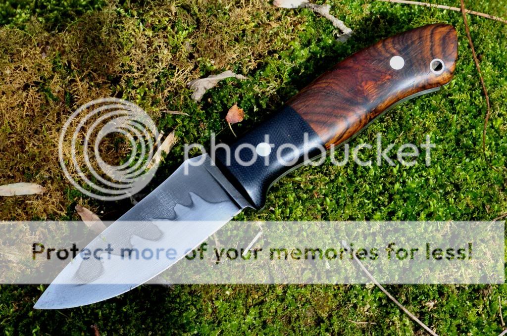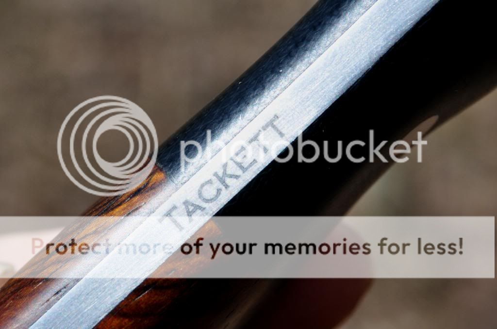 Some of you guys here may be familiar with Mathew Tackett of Tackett Custom Knives, and some may not be, as Matt is relatively new in the knife making scene. I met Matt briefly at the Becker gathering back in the autumn, though he wouldn't remember it as I have a tendency to just quietly observe makers I am unfamiliar with at first. He was delivering some knives and I got to check one of them out later on that day, and I liked what I saw. Matt has a style that was a bit different than most of what I had been seeing around, so I started watching his work in the Backwoods & KFU forum where he posts his work. I saw that he was doing some really nice contours, and doing some nice bolster work as well as hamons. Later I contacted Matt about doing a specific knife for a project I had in mind. We talked it out , discussed the uses I had in mind for it, and we settled on a variant of what he refers to as his general utility model... Matt, I think it needs a name man...with a full flat grind, a hamon, black micarta bolsters, cocobolo handles scales, and stainless pins and lanyard tube.
