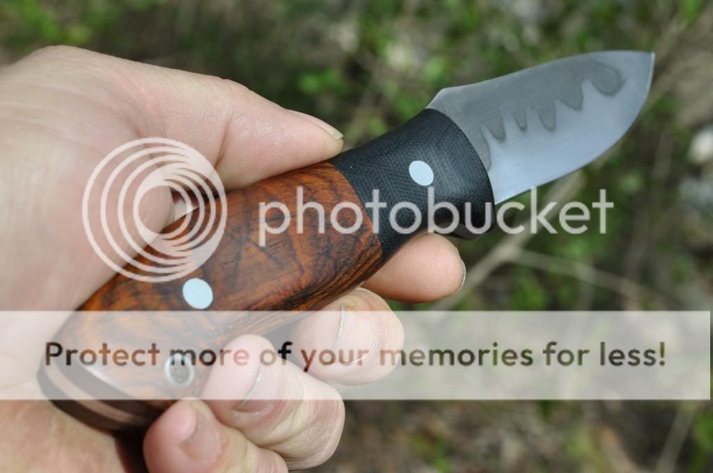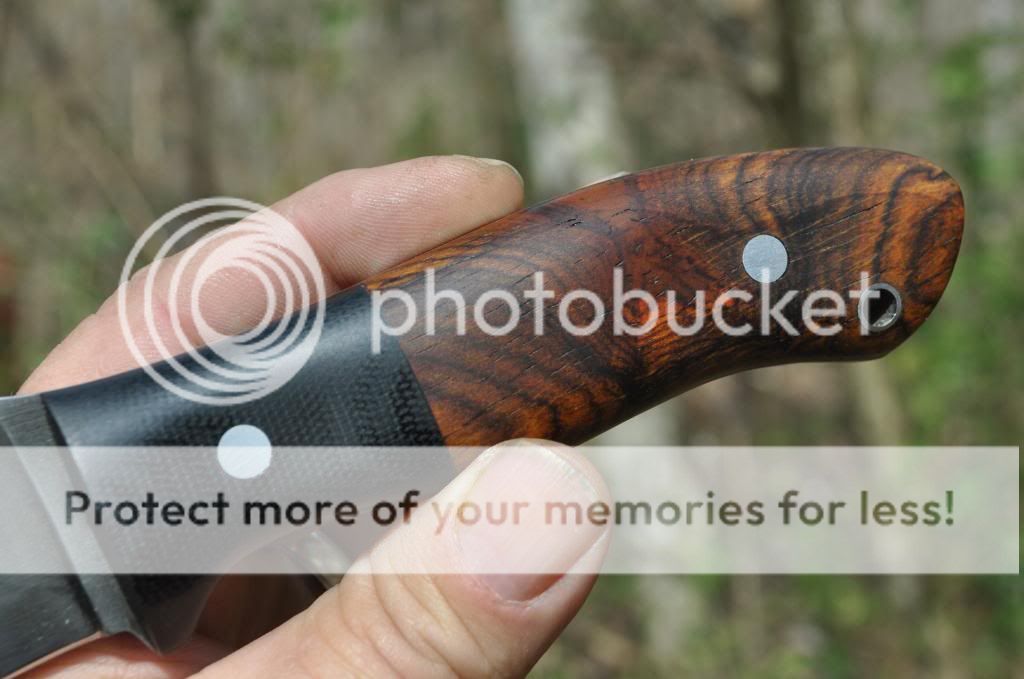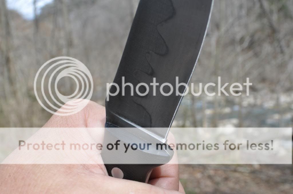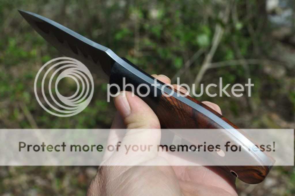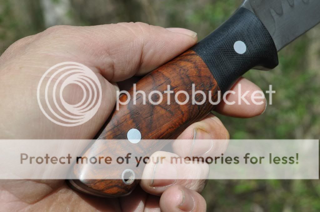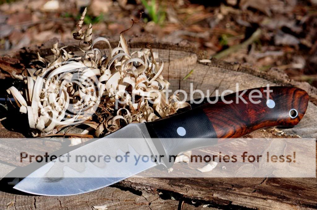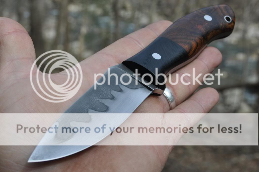 Some of you guys here may be familiar with Mathew Tackett of Tackett Custom Knives, and some may not be, as Matt is relatively new in the knife making scene. I met Matt briefly at the Becker gathering back in the autumn, though he wouldn't remember it as I have a tendency to just quietly observe makers I am unfamiliar with at first. He was delivering some knives and I got to check one of them out later on that day, and I liked what I saw. Matt has a style that was a bit different than most of what I had been seeing around, so I started watching his work in the Backwoods & KFU forum where he posts his work. I saw that he was doing some really nice contours, and doing some nice bolster work as well as hamons. Later I contacted Matt about doing a specific knife for a project I had in mind. We talked it out , discussed the uses I had in mind for it, and we settled on a variant of what he refers to as his general utility model... Matt, I think it needs a name man...with a full flat grind, a hamon, black micarta bolsters, cocobolo handles scales, and stainless pins and lanyard tube.