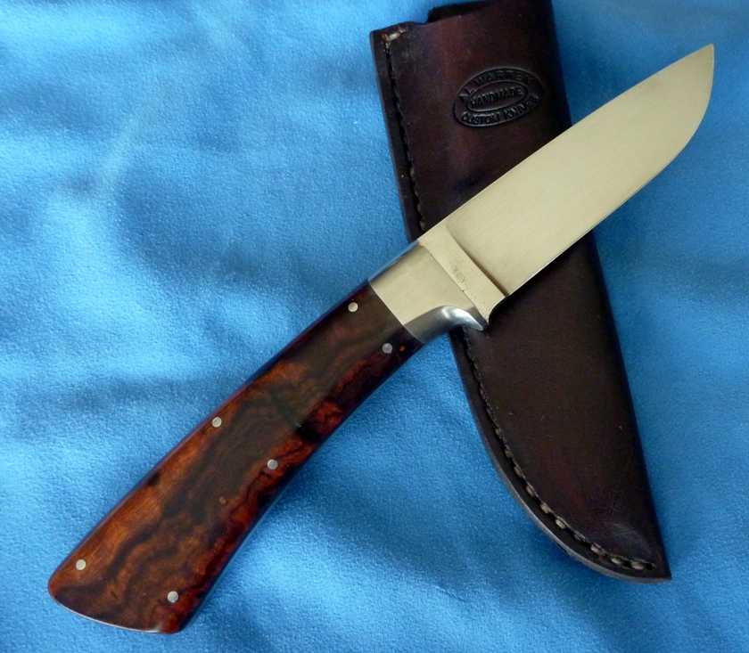 Beautiful figured Desert Ironwood pinned handles, with a stainless bolster. Full tang fixed blade.