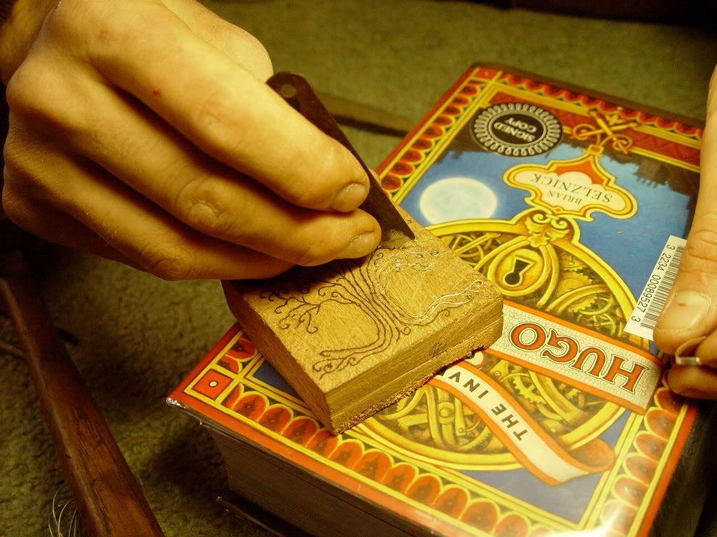 First I drew it out on paper, made up my mind about the final image, then drew it freehand on the wood with a ballpoint pen, using the paper as a reference. I made a hacksaw blade tool about 1.3 mm wide and notched it in little by little. I used a simple pair of scissors to cut the wire, and a small-faced hammer to pound it in. Then of course I sanded it all down and stained the wood.