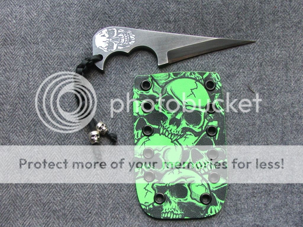Green Skull Kydex sheath drilled for a large Tecklok. Paracord lanyard with skull beads.