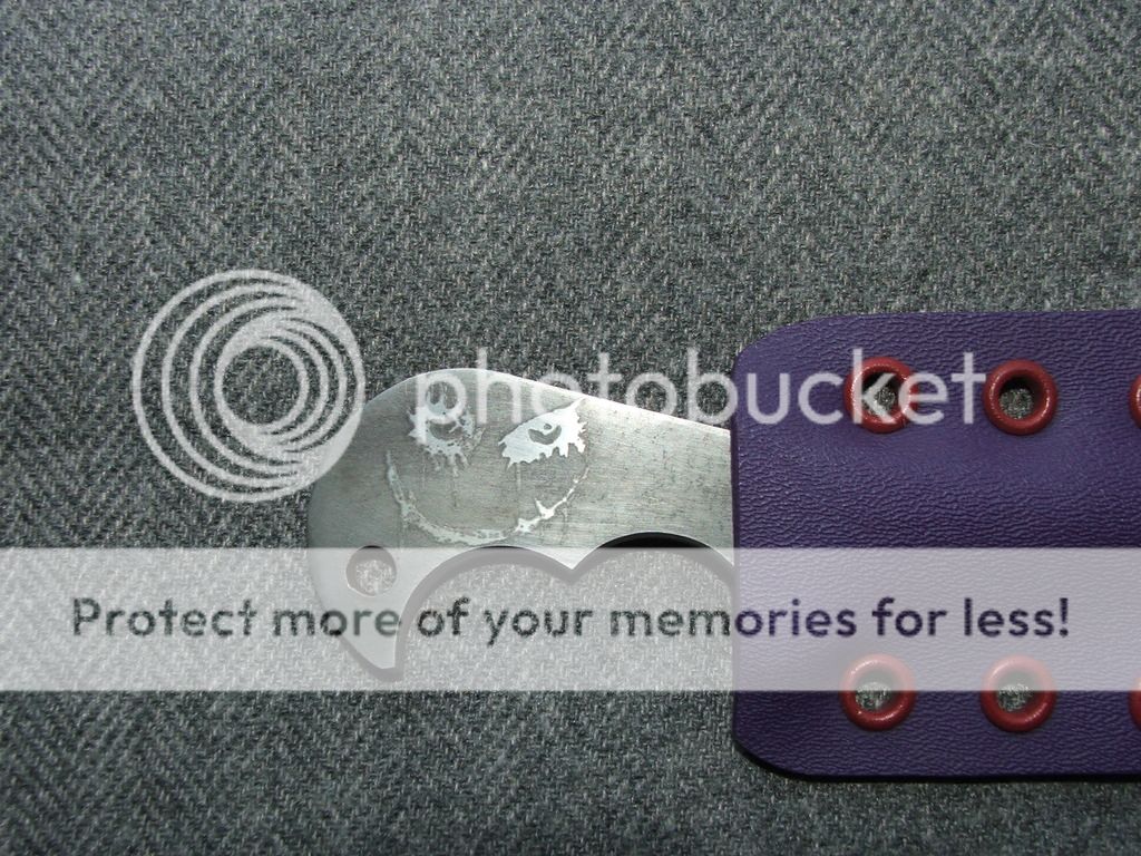 Purple Kydex sheath drilled for a large Tecklok. If you want a lanyard, we will make one for this knife.