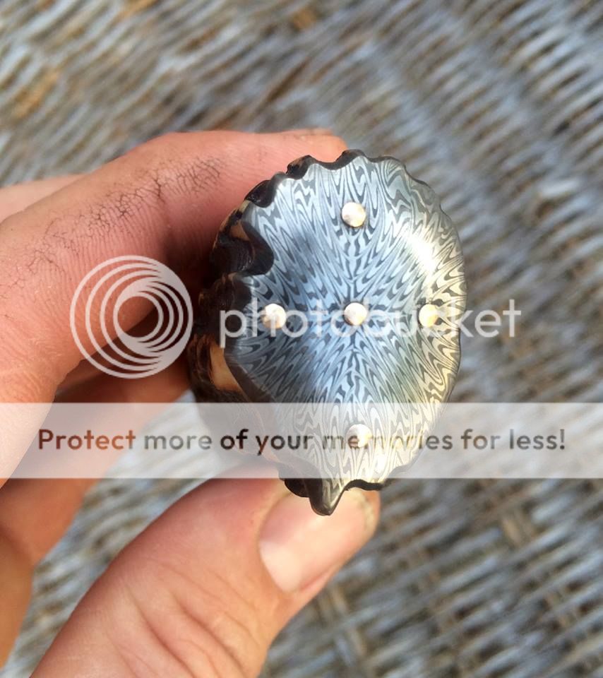Adams created the Damascus for the blade and file-worked buttcap, with beautiful Sambar Stag handle and a bronze spacer and pins.