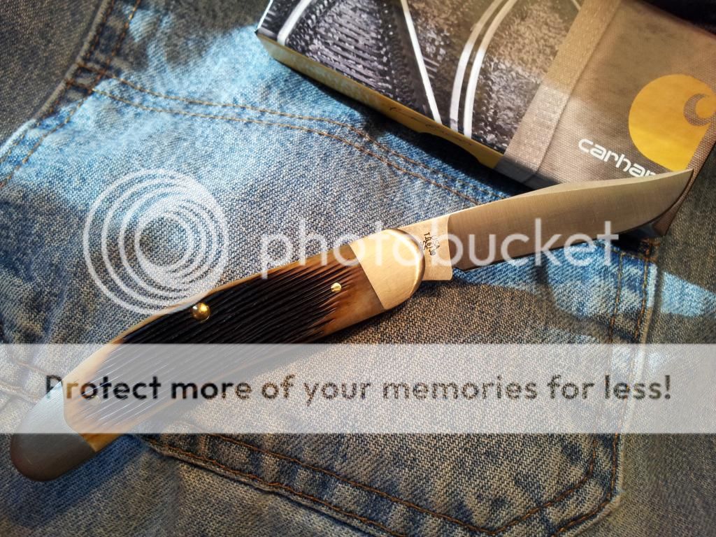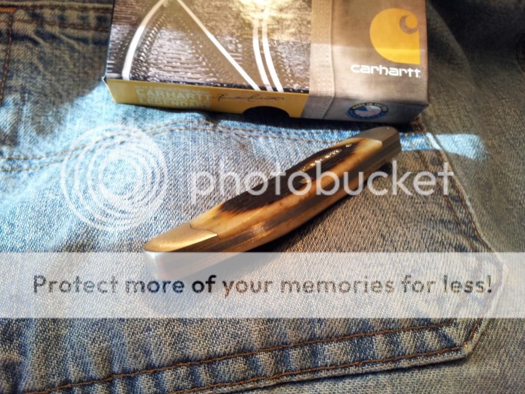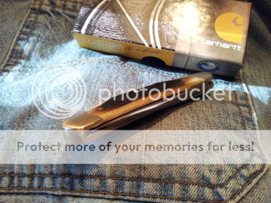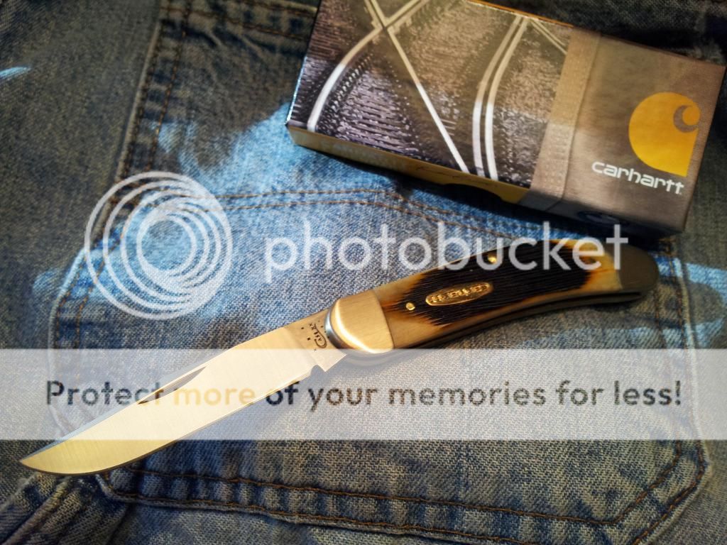 Case Carhartt Sowbelly- Mint in box. Satin finished blade and bolsters which are stunning and will wear much better. Brass shield inlay. 5 on the pull and nice snap. A smidge off center if you look close. Solid fit and finish....traded Shipped