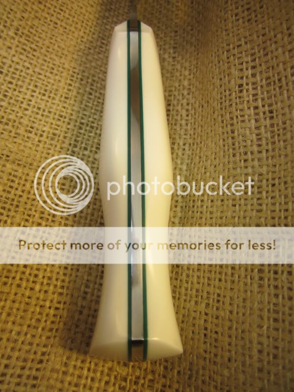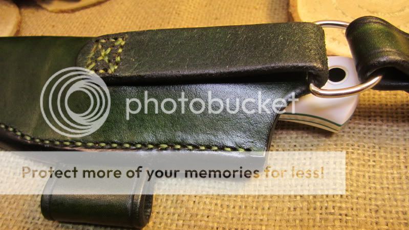Here is a knife that used to be my grail knife. A Ray Mears' Woodlore inspired blade. The knife steel is O1 with a scandi grind. Handle is white corian with green liners. Handle hardware is stainless. The sheath is very well made and dyed green to match the liners. This knife was a totally custom build commissioned by me. It's not often you see Cody's knives come up for sale because they sort of beg to become your companion. He actually quit taking custom orders a little after this piece was finished.