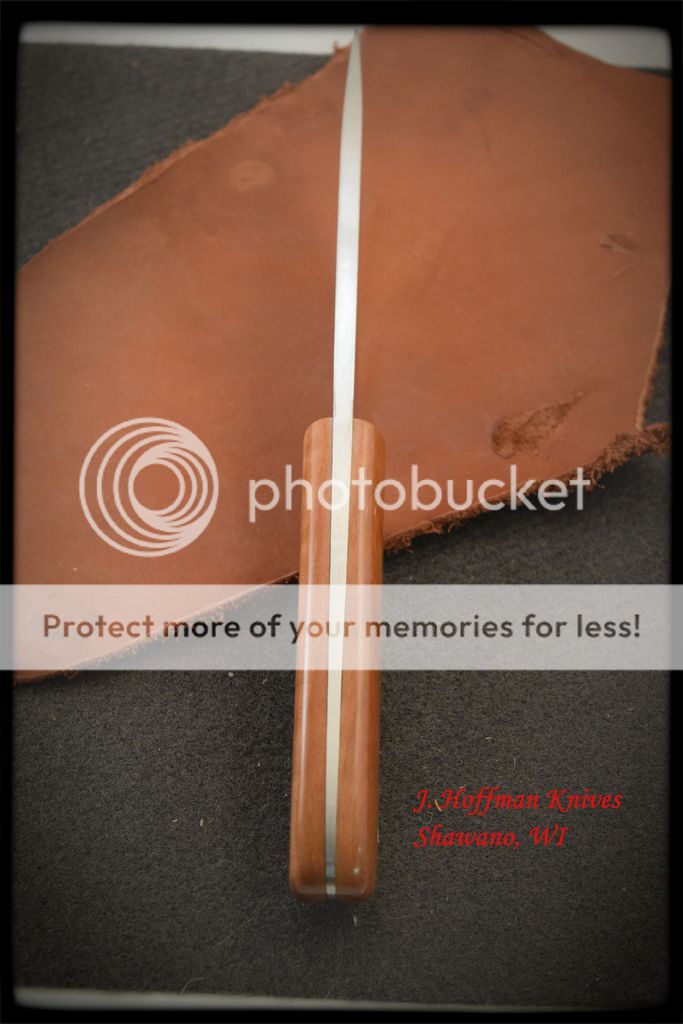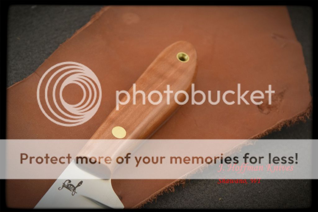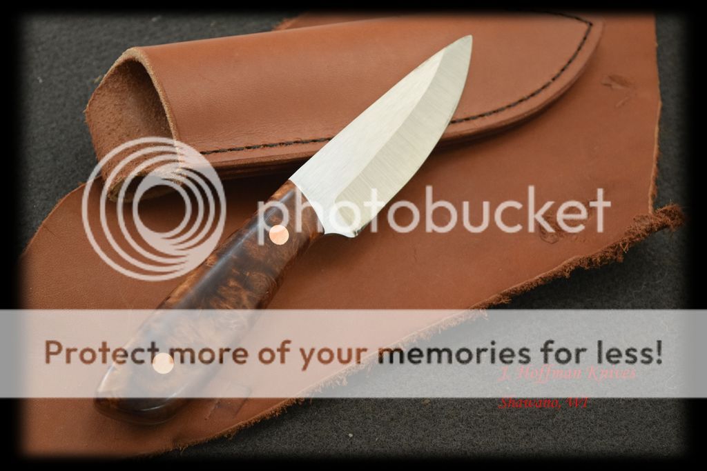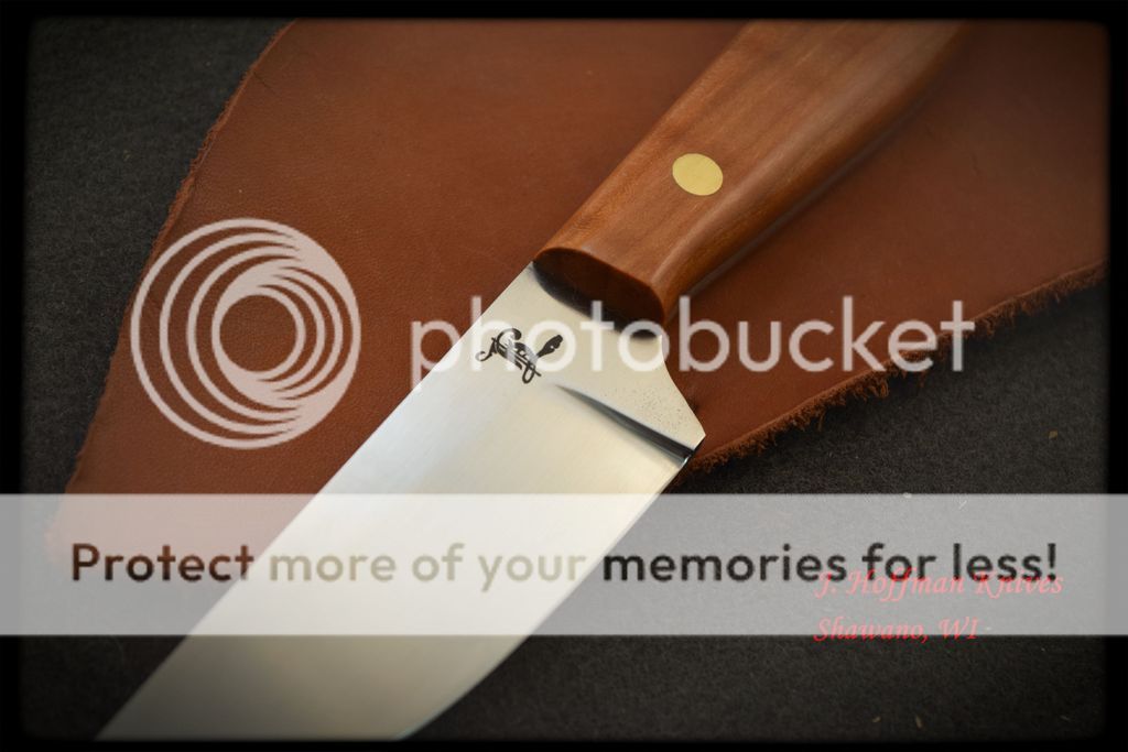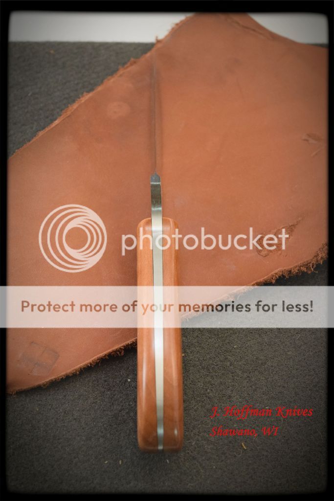 This is a Large Kilkenny model. The blade is CPM S30V. The handle is stabilized Curly Cherry. The hardware is brass. The blade is flat grind with a 800 grit hand-rubbed satin finish. The knife has a tapered tang. No Sheath with this knife. Questions and comments are always welcome. Thanks